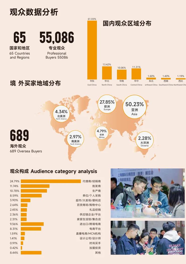 :来自 65 个国家和地区的 55,086 名专业买家到场,其中海外买家 689 人;国内观众以华东地区(61.03%)为主,华北、华南、华中占比超 37% - 观众画像
