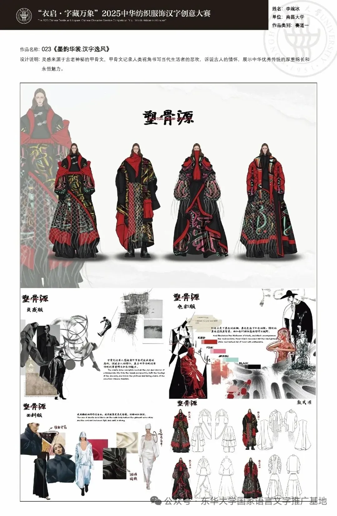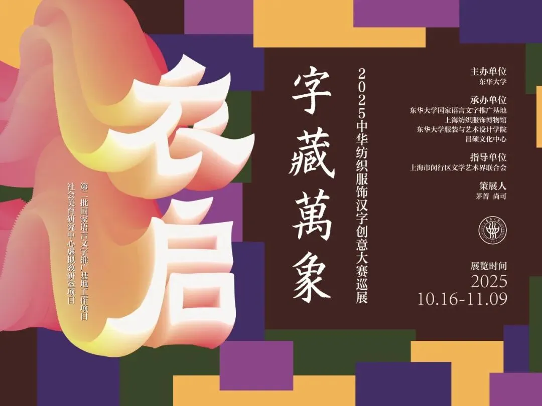 “衣启·字藏万象”2025中华纺织服饰汉字创意大赛作品展巡展于2025年10月16日在昌硕文化中心举办。大赛设立纺织服饰汉字元素作品、纺织服饰品牌标识汉字设计两大赛道,共征集作品129件,经评审遴选65件优秀作品进行集中展示。展览不仅生动呈现了汉字结构与纺织纹样、服饰造型之间的创意交融,更以巡展的形式走进高校与公众空间,拓展了汉字文化传播的广度与深度,推动“活着的遗产”融入当代审美与日常生活。
