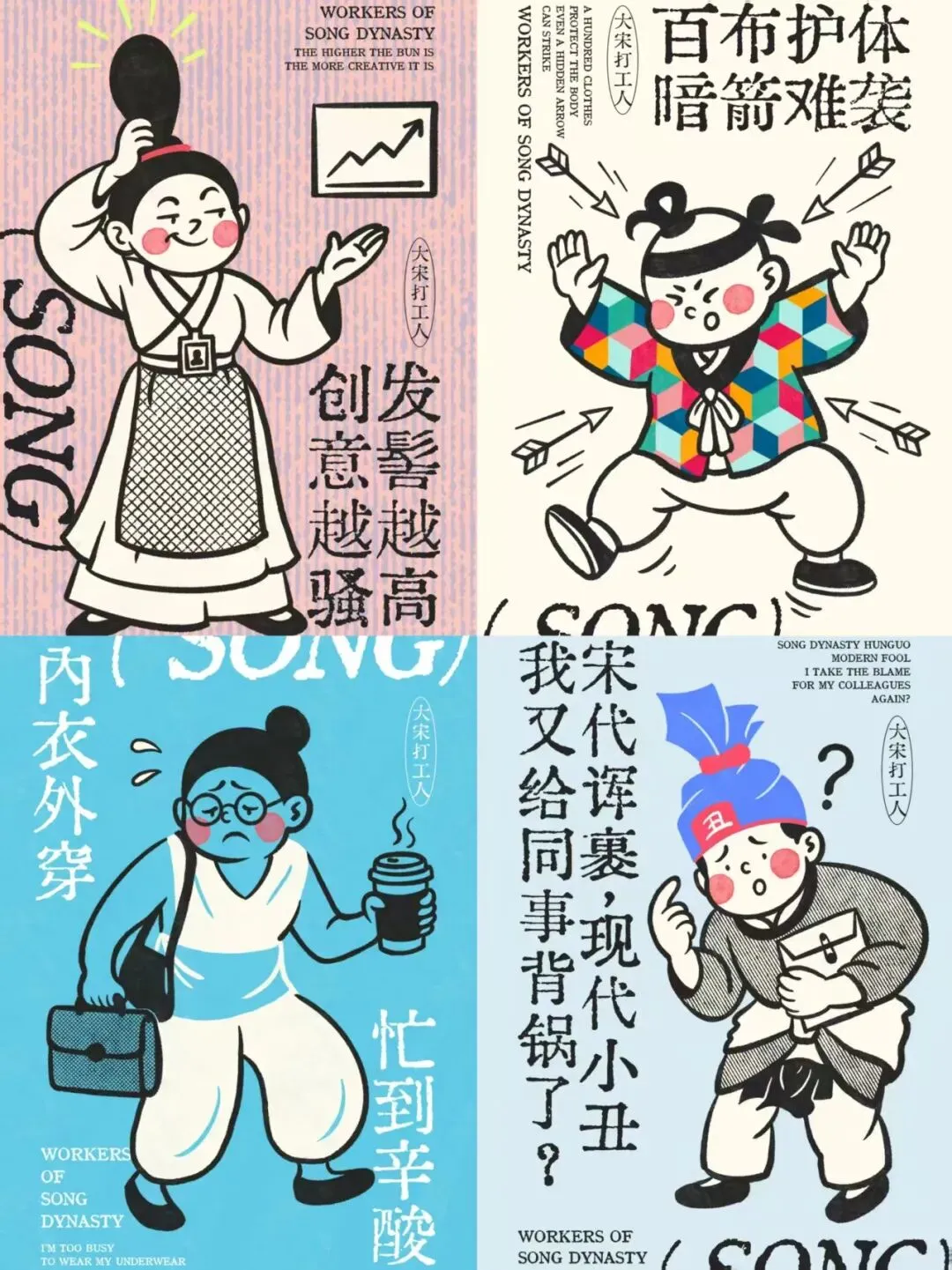 系列作品中,无论是“创发意髻越越骚高”里宋代仕女风的发髻与“创意高发”的职场隐喻,还是“百布护体暗箭难袭”中宋代织锦服饰与职场“防坑”心态的结合,都在历史场景与当代语境的错位中,唤醒了观者对文化与生活的双重共鸣——让宋代服饰不再是博物馆里的静态标本,而是成为当代打工人抒发职场情绪的文化载体。