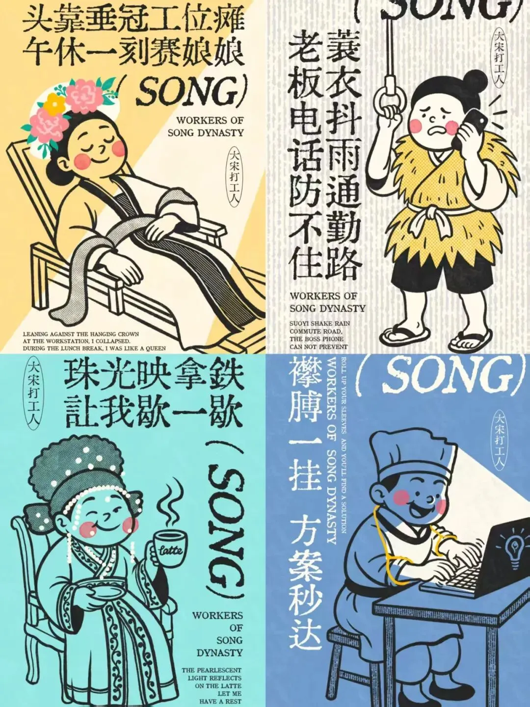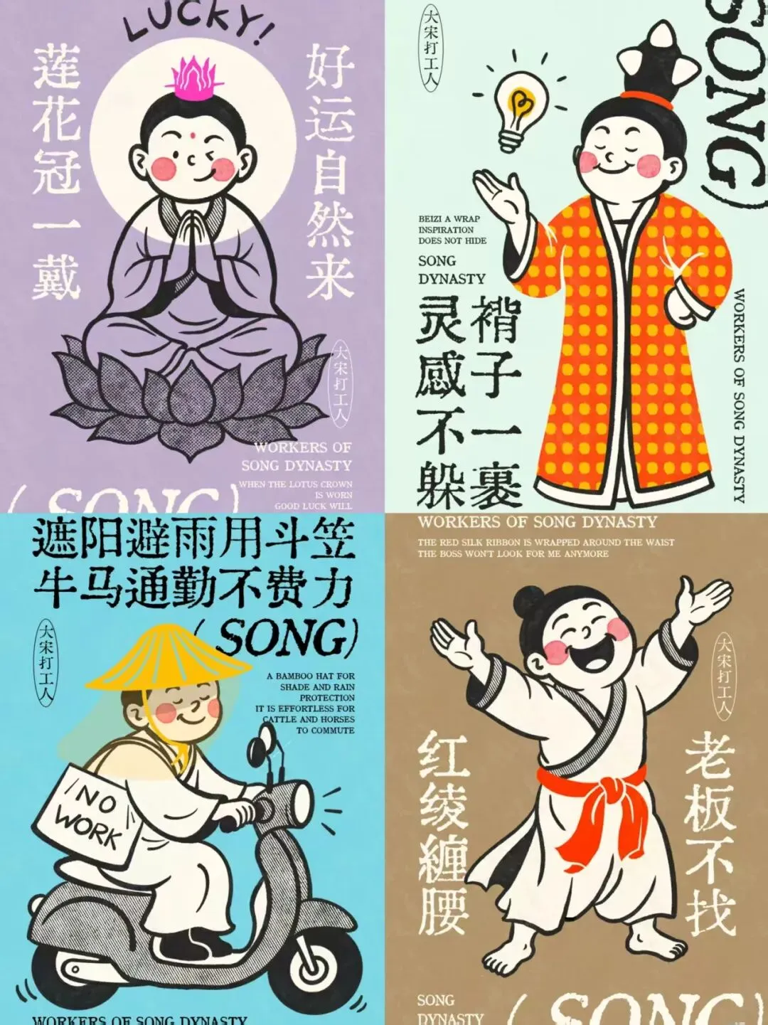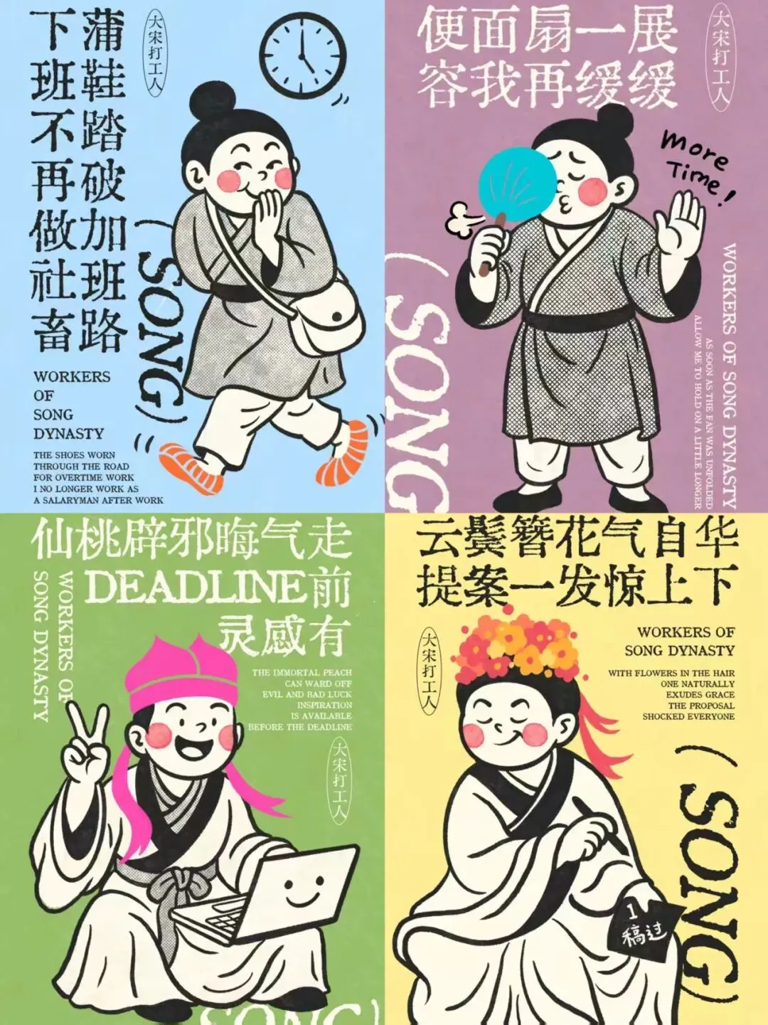 —— 服饰形制的符号化:宋代襦裙、褙子、幞头、斗笠等服饰形制被提炼为视觉符号,如“遮阳避雨用斗笠,牛马通勤不费力”中,斗笠从宋代的实用配饰,转变为当代打工人通勤“装备”的趣味象征,让服饰形制成为连接古今生活场景的纽带。