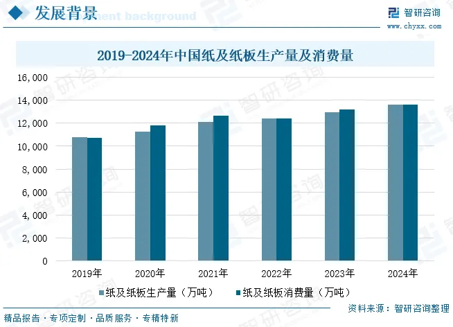 中国造纸工业历经数十年高速发展,已实现从“跟跑”到“领跑”的跨越。目前我国造纸行业呈现“规模增长与利润承压并存、结构升级与转型加速并行”的态势。中国造纸协会数据显示,2024年全国纸及纸板生产企业约2600家,全国纸及纸板生产量13625万吨,较2023年增长5.09%;消费量13634万吨,较2023年增长3.56%,人均年消费量为96.83kg。