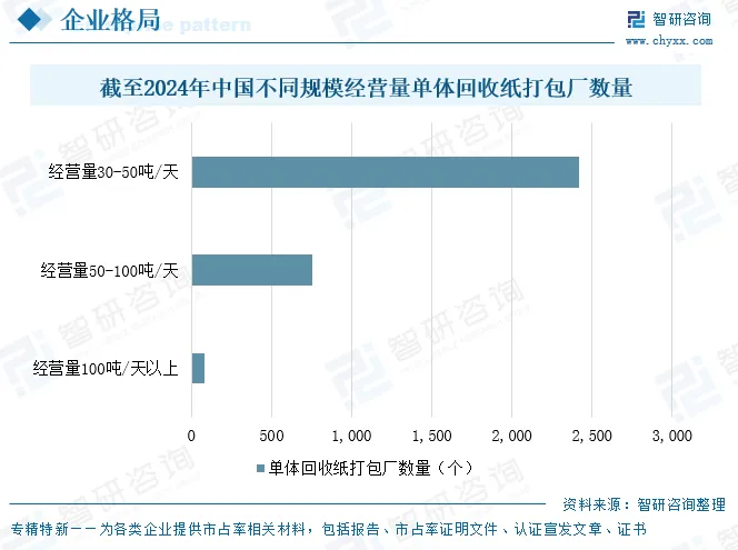 我国废纸回收行业企业众多,竞争格局较为分散,且以中小企业为主。2024年国内经营量100吨/天以上单体回收纸打包厂共计81个,较2023年减少35个,同比下降30.2%。究其原因,随着国内行业愈发规范化以及市场价格下降的影响等,加之回收纸市场需求趋于稳定,以及部分地区回收纸总量有限,致使大型打包厂数量有所减少。经营量50-100吨/天单体回收纸打包厂数量为755个,较上年略有增长,同比微增5.0%。其原因主要是随着回收纸市场采购需求趋稳,致使中型回收纸打包厂数量相对稳定。经营量30-50吨/天单体回收纸打包厂数量为2420个,较2023年减少2.1%。整体来看,行业仍面临利润微薄、竞争粗放的挑战,2024年回收纸行业前20强企业平均净利率仅为1.13%,处于较低水平。