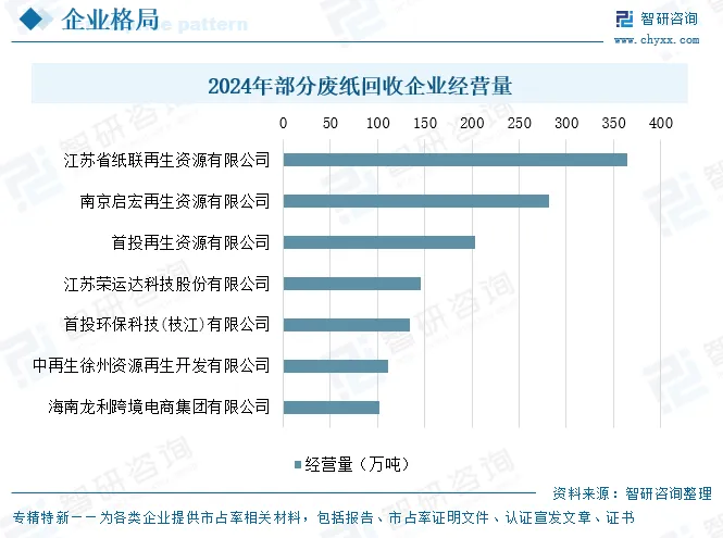 2024年,江苏省纸联再生资源有限公司、南京启宏再生资源有限公司、首投再生资源有限公司、海南龙利跨境电商集团有限公司、江苏荣运达科技股份有限公司、中再生徐州资源再生开发有限公司、首投环保科技(枝江)有限公司等企业经营量均在百万吨以上,其中江苏省纸联再生资源有限公司经营量为365万吨;南京启宏再生资源有限公司、首投再生资源有限公司经营量分别为282.15万吨、203.7万吨。
