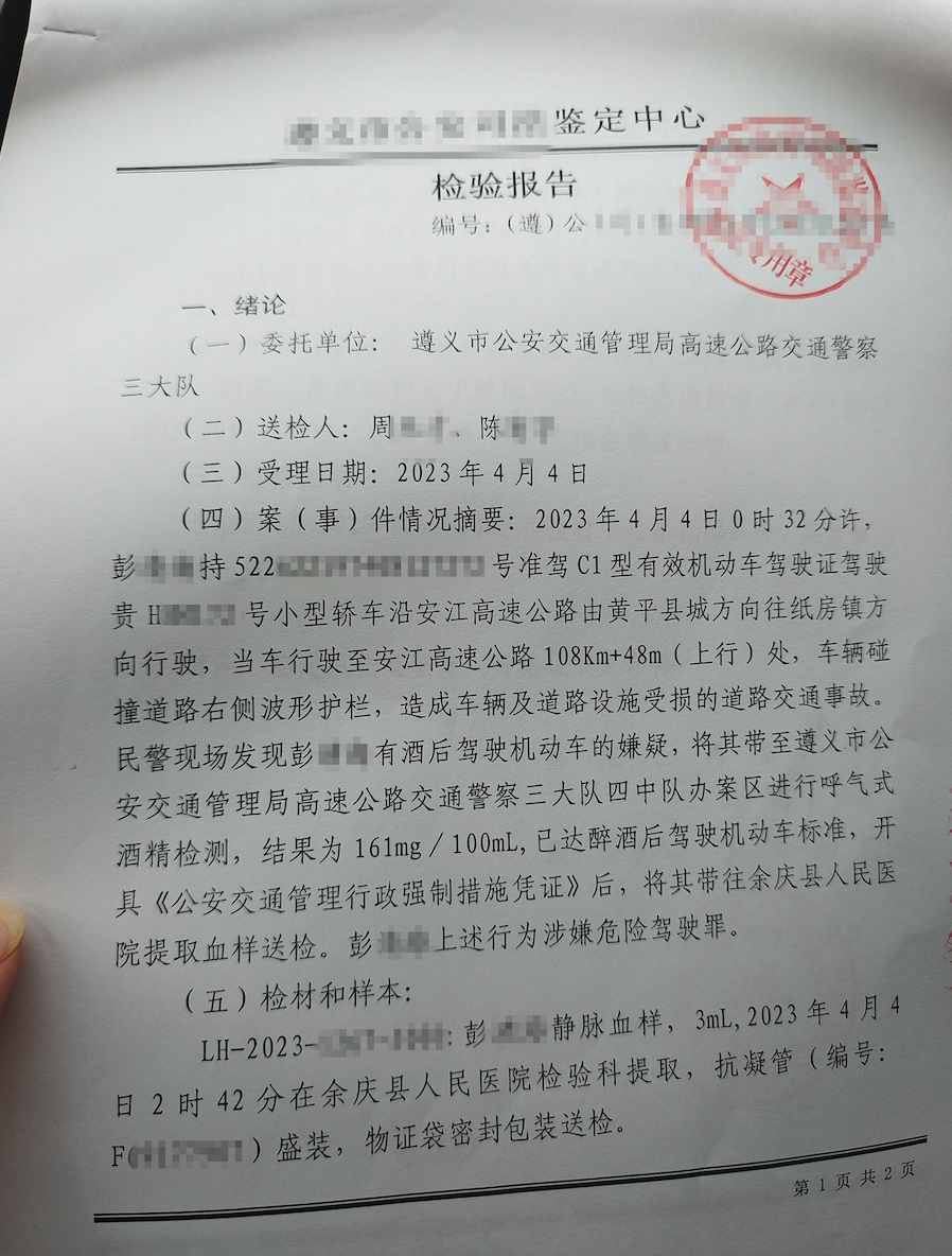 对现场勘查完毕后,受损的黑色小轿车由拖车拖离高速,道路恢复正常通行,驾驶人彭某则被民警带回中队进行呼气式酒精检测。经呼气式酒精测试仪检测,彭某体内的酒精含量为161mg/100ml,涉嫌醉酒驾驶机动车。随后民警将彭某带至余庆县人民医院进行抽血检验。