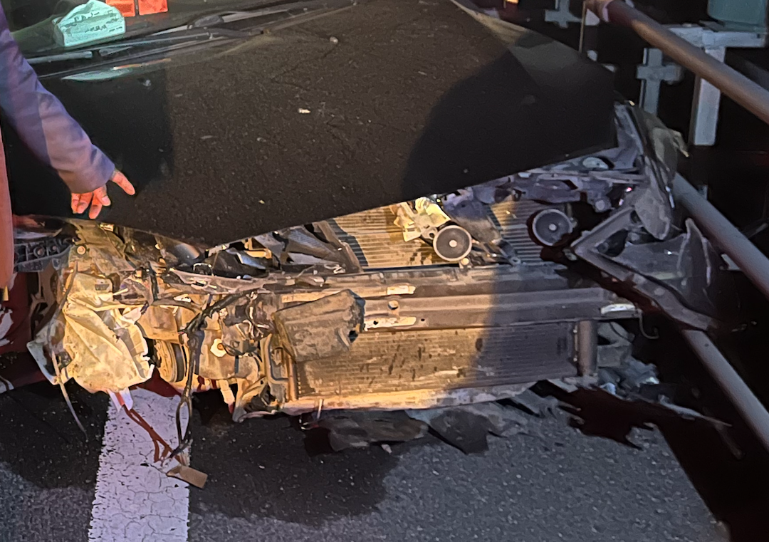 民警立即赶往事故现场,在事发路段看见一黑一白两辆小轿车一前一后分别停在道路超车道及应急车道内。黑色小轿车车头严重变形,车辆近乎报废。白色小轿车则是报警人朱某所驾驶的车辆。