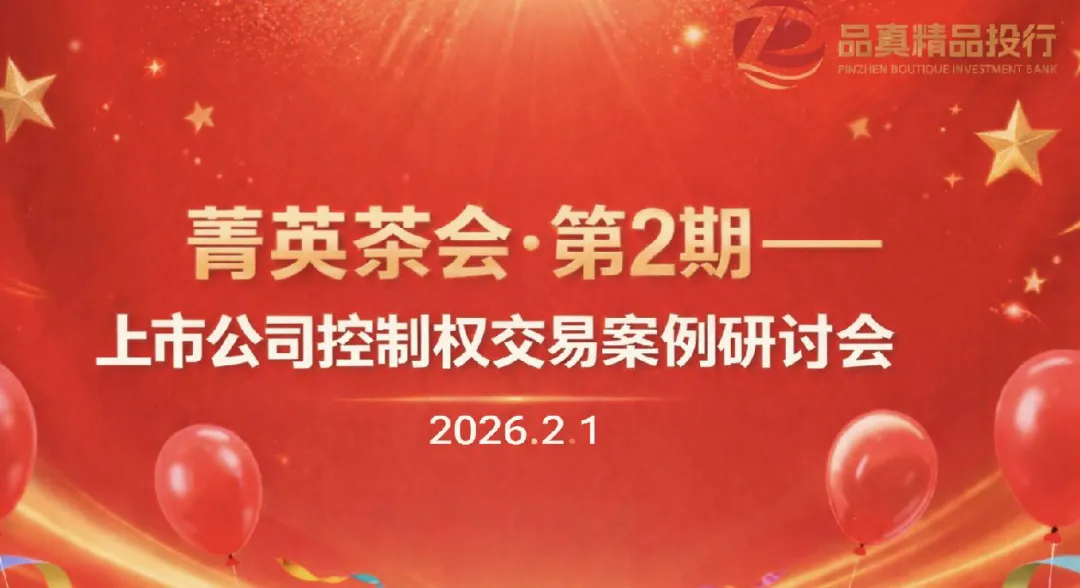 2026年2月1日,菁英茶叙会第2期——“上市公司控制权交易”案例研讨会在品真精品投行成功举办。来自紫光股份、威星智能、原贝因美、慧博云通、杭州高新等上市公司的高管代表、产业投资方、杭金投等国资平台、平安证券、天健会计师事务所、北京嘉润律师事务所及杭州鑫澳、上海名衍投资等精品投行创始人等参与了本场精品沙龙活动。