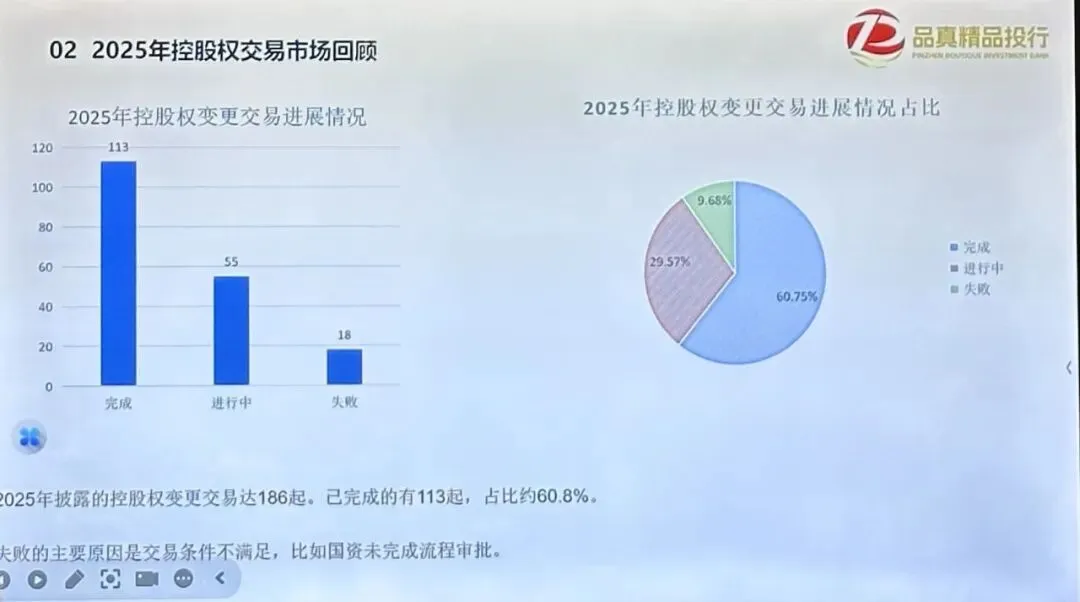 品真精品投行创始人屈哲锋先生首先分享了2025年A股上市公司控制权交易市场的多维观察数据,同时选取了上纬新材(688585)、天普股份(605255)、锋龙股份(002931)等部分热门交易案例进行深度剖析,并结合近期披露的交易案例,分析了趋紧从严的政策变化及对后续交易可能带来的影响。