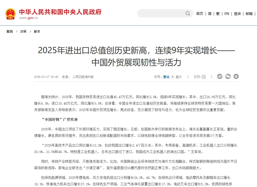 据海关统计,2025年我国货物贸易进出口总值45.47万亿元,同比增长3.8%,连续9年实现增长。其中,出口26.99万亿元,同比增长6.1%;进口18.48万亿元,同比增长0.5%。海关总署副署长王军表示,2025年高技术产品出口同比增长13.2%,拉动我国出口增长2.4个百分点。其中,专用装备、高端机床、工业机器人出口分别增长20.6%、21.5%和48.7%。特别是工业机器人,去年出口超过了进口,我国成为工业机器人的净出口国。