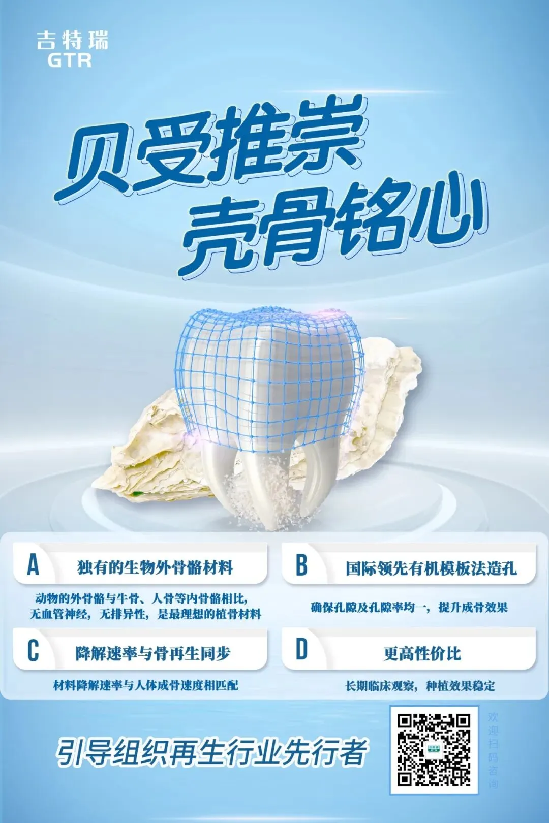 吉特瑞在本次会议中将向公众展示国际首创的全新一代煅烧植骨材料。这款以海洋贝壳为原料、经特殊煅烧工艺制备的植骨材料,凭借与人体骨高度匹配的三维多孔结构与羟基磷灰石成分,实现了骨传导性与组织相容性,可显著促进新骨爬行替代与血管长入,为口腔种植、牙槽嵴增量、骨缺损修复提供更稳定、更高效的再生方案。