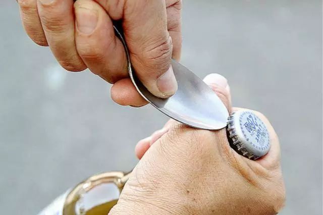 家中会有一些金属勺子,用它来开啤酒瓶盖刚刚好。首先将勺子边缘放在啤酒瓶盖下方,之后用力将勺子网上撬,使瓶盖边缘受力后向上翘起,没几下就能将瓶盖打开。