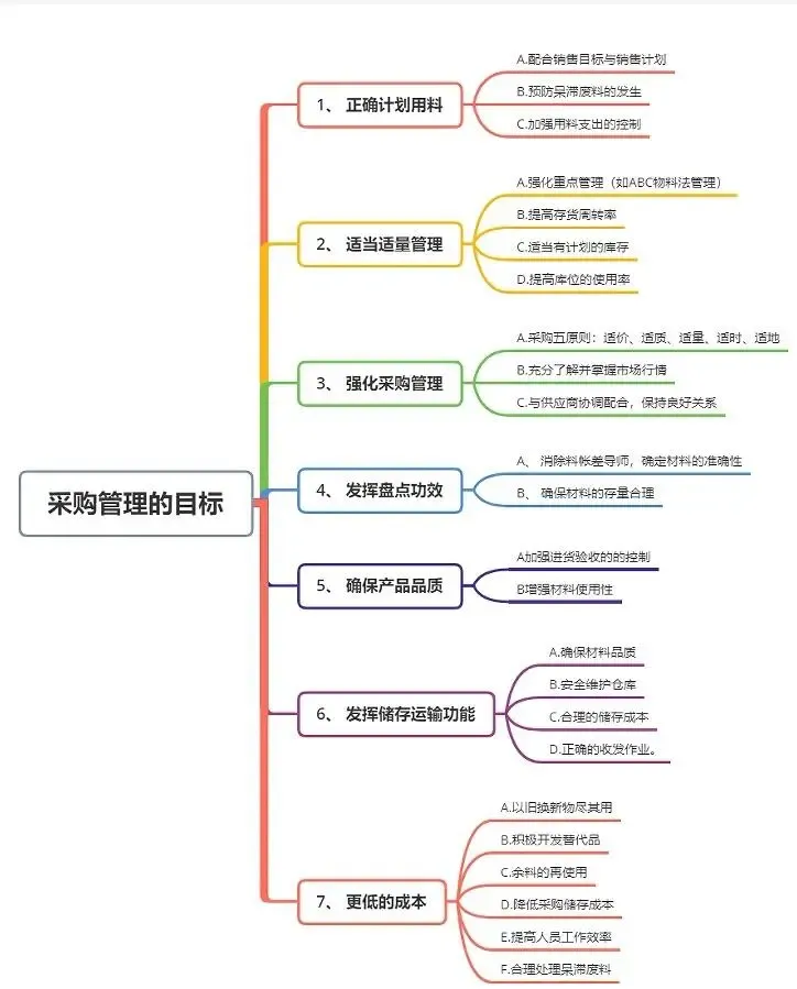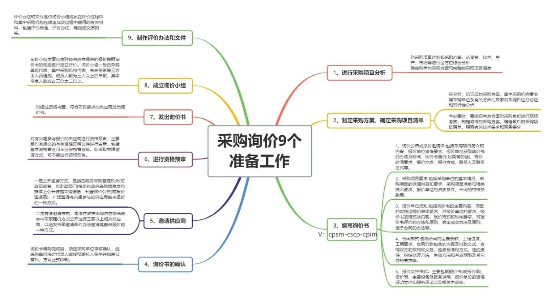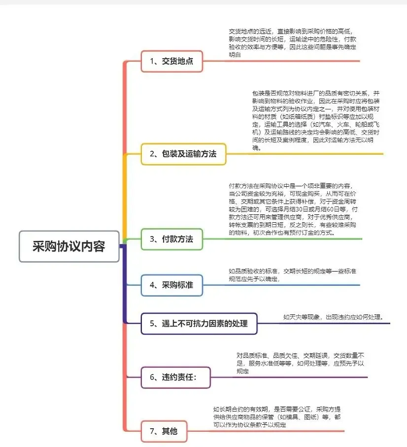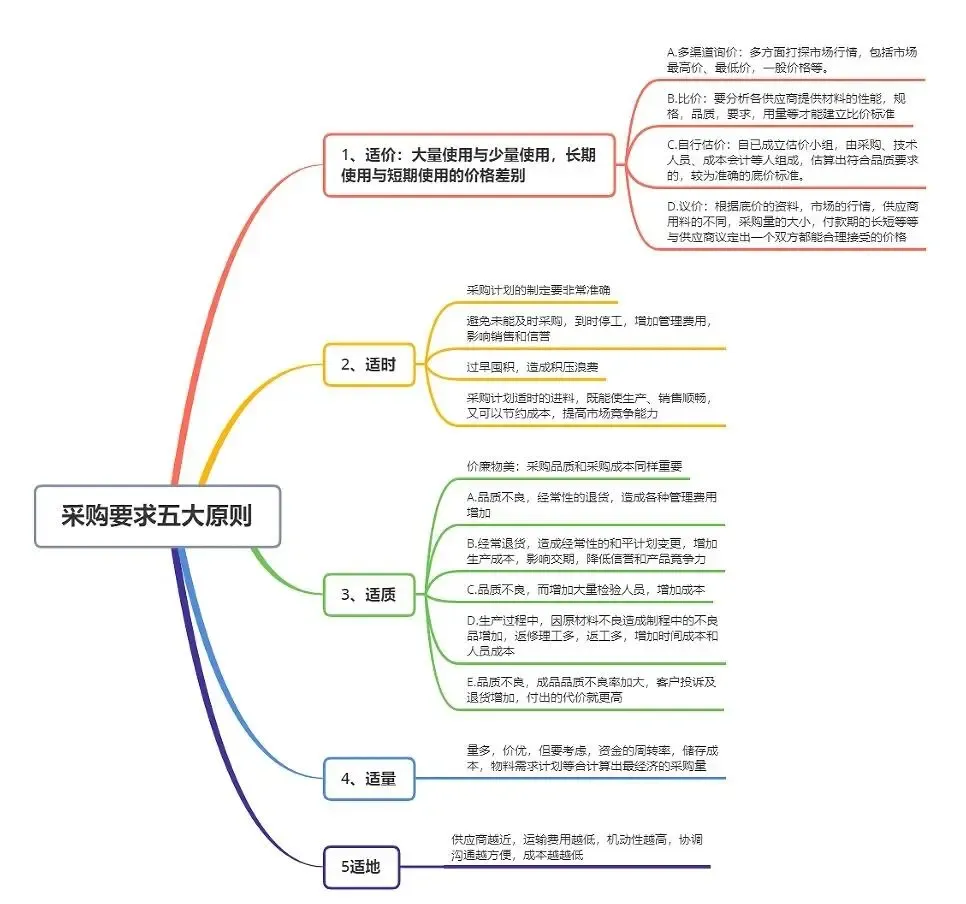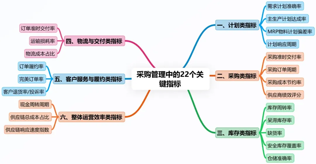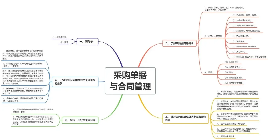 采购思维导图(采购单据与合同管理、采购预算编制、采购要求5大原则、采购询价、采购协议、方法、中22个关键指标)