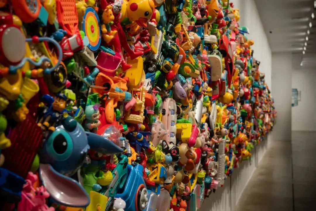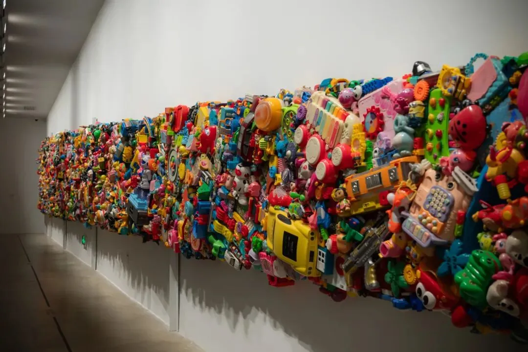 《景观墙》中陈列的废弃玩具除了能让观者联想到自己的童年之外,这些玩具也在提醒着观者在当下社会,玩具的产量过盛,无论年轻人还是儿童均成为了玩具市场的主力消费客群。大家为了追赶潮流会不断的购买新的玩具,而旧的已经过气了的玩具则容易被人们丢弃。但是很少有人关注和思考玩具被丢弃后的去向。