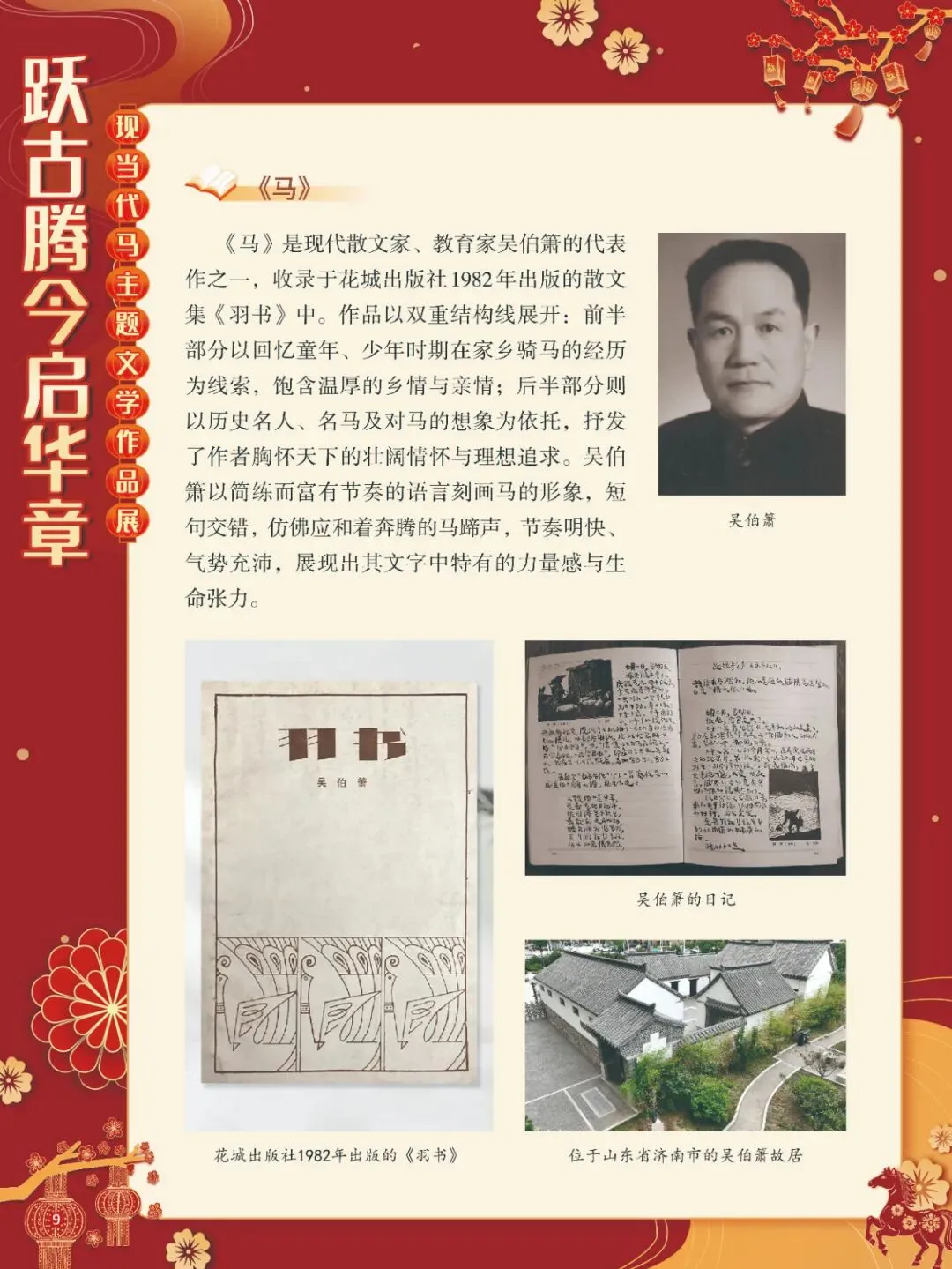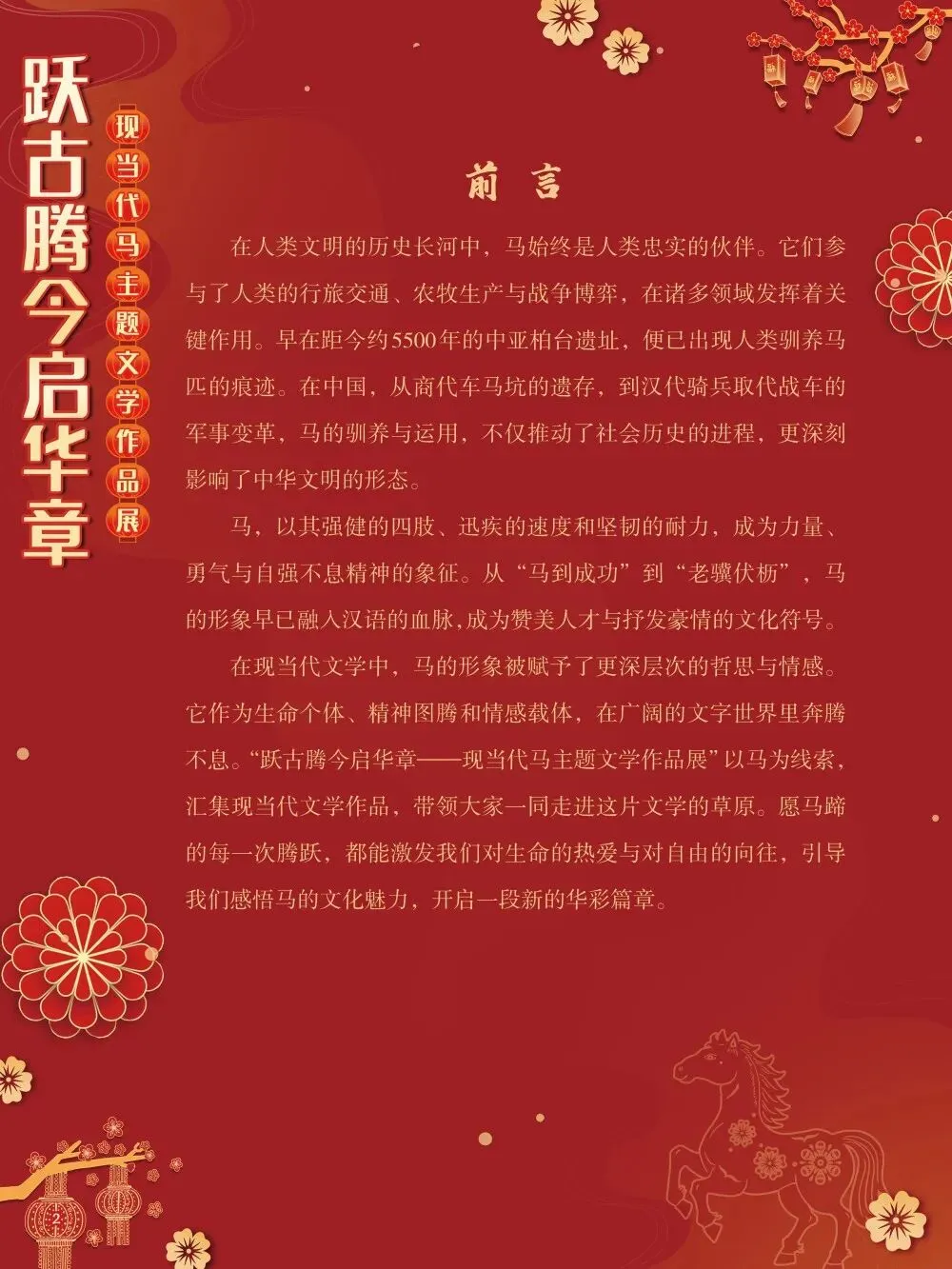 马,是人类文明进程中忠诚的伙伴与力量的象征,其形象承载着厚重的历史记忆与丰富的文化意涵。从远古先民的驯化之举,到沙场之上的奔腾嘶鸣,再到文人笔下的千里之志,马在人类历史中的独特地位毋庸置疑。本展览以“马”为文化纽带,聚焦现当代文学领域,通过精选的文学作品,既延续了马在中国传统文化中的精神象征,亦呈现了当代作家以全新文学视角,对人与自然、人与命运关系的深刻审视与思考。