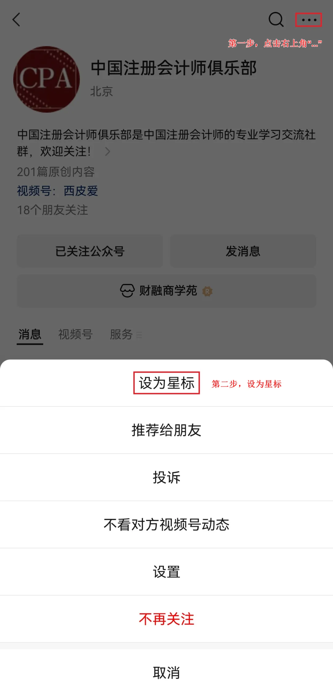 操作方法:点击文首蓝字关注【中国注册会计师俱乐部】,进入主页后点击右上角菜单栏,设为星标!