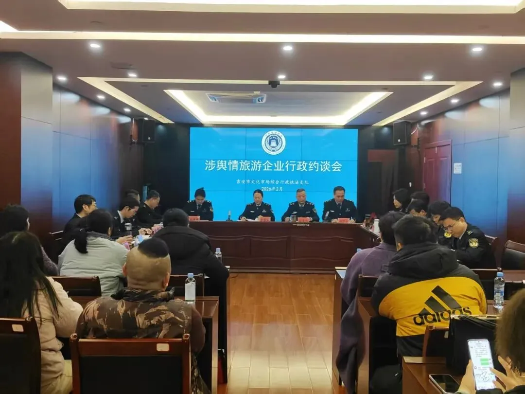 为保障2026年春节长假旅游市场平稳有序,为游客营造安全、舒心、放心的旅游环境,针对游客反映强烈且易引发舆情的“不合理低价游”等问题,2月4日,市文化市场综合行政执法支队召开涉舆情旅游企业行政约谈会。市文广旅局党委委员、支队长曾季丽出席会议并讲话,支队分管副支队长、有关科室负责人,各县文化执法大队负责同志及27家相关旅游企业负责人参加会议。