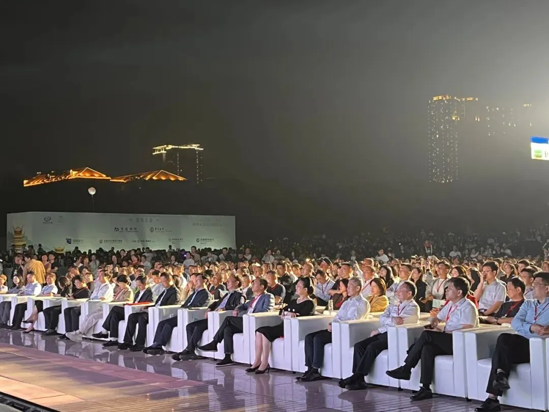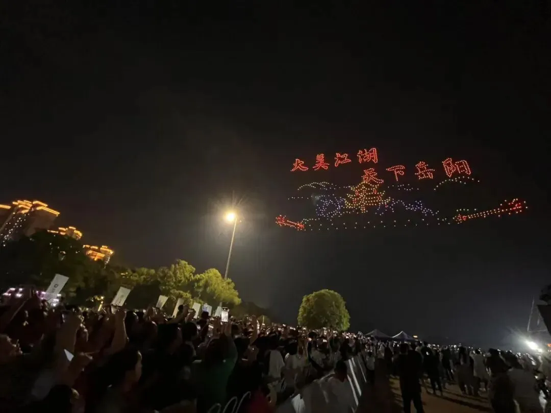 1200架无人机闪亮南湖,成为此次推介会的一大亮点。以天为幕、以星为笔,立体呈现岳阳剪影跃然云端,幻化星河轨迹,南湖水面水天一色,升腾起动态光影画卷,为这场文旅盛会更增添了几分科技与艺术相结合的魅力。