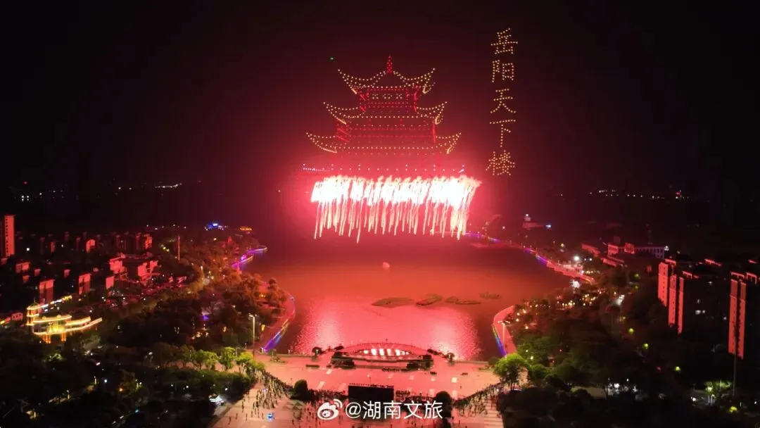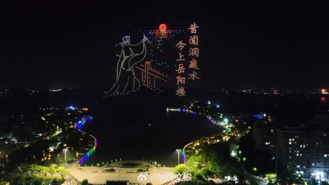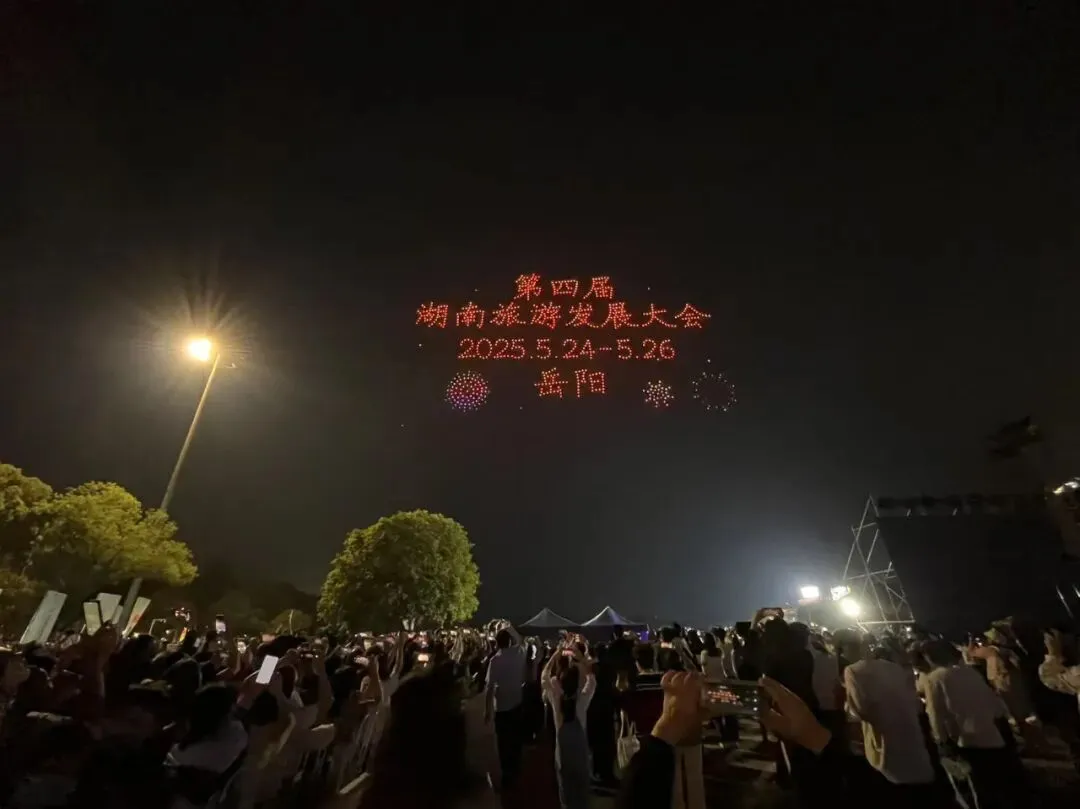 1200架无人机闪亮南湖,成为此次推介会的一大亮点以天为幕、以星为笔,立体呈现岳阳剪影跃然云端,幻化星河轨迹,南湖水面水天一色,升腾起动态光影画卷,为这场文旅盛会增添了几分科技与艺术相结合的魅力。