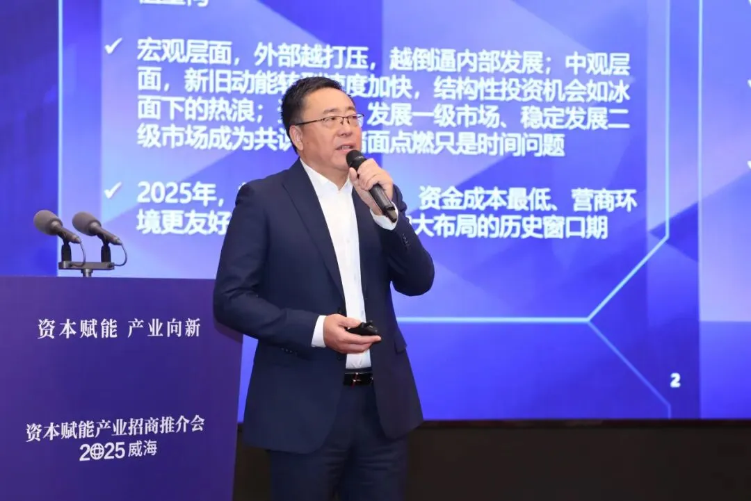 投资机构威海“论剑”, 资本助力产业振兴。11月5日,“资本赋能产业招商推介会·2025威海”成功举行,来自国内有影响力的头部投资机构、券商、金融机构和优秀企业的近200位嘉宾相聚威海,与威海各区市和企业牵手寻求资本赋能产业发展新机遇。市委副书记、市长孔凡萍,中国国际金融股份有限公司管理委员会成员胡长生,前海方舟资产管理有限公司董事长靳海涛,江苏毅达股权投资基金管理有限公司董事长、创始合伙人应文禄,山东省国资委副主任周洪文,中国银行山东省分行副行长薛冬出席会议,孔凡萍、胡长生、薛冬致辞,市委常委、常务副市长李建主持。