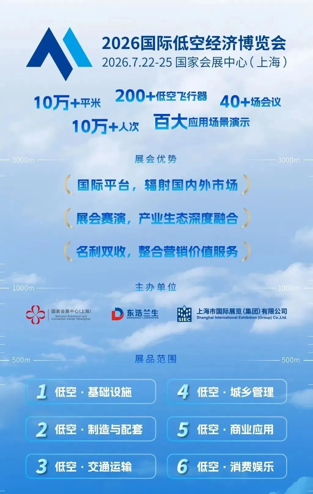 2025国际低空经济博览会于7月23-26日,在国家会展中心(上海)顺利举办。由国家会展中心(上海)、东浩兰生集团和上海市国展集团共同主办,围绕低空经济这一战略性新兴产业的国际化专业博览会。