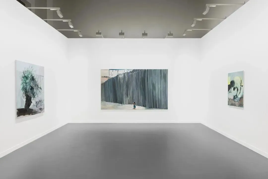出自《倚墙而靠》系列的《橄榄树》(2010)、《风景中的人物》(2010)、《跪着生活》(2010 )在巴塞尔艺术展卡塔尔展会现场,卓纳展位M310号,2026年