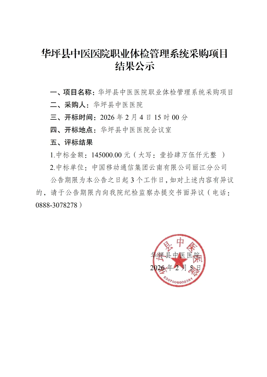 华坪县中医医院职业体检管理系统采购项目结果公示
