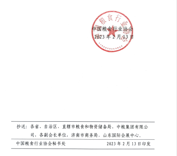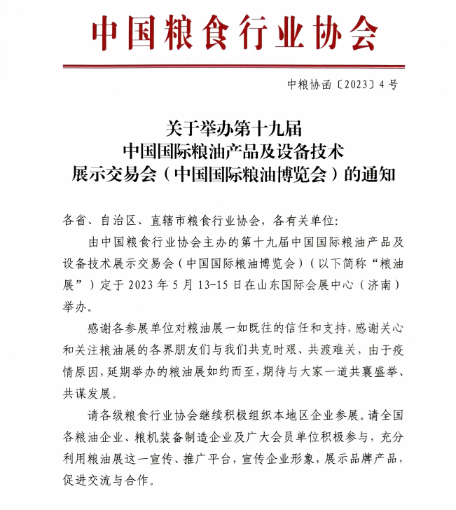 由中国粮食行业协会主办的第十九届中国国际粮油产品及设备技术展示交易会(中国国际粮油博览会)(以下简称“粮油展”)定于 2023 年 5 月 13-15 日在山东国际会展中心(济南)举办。