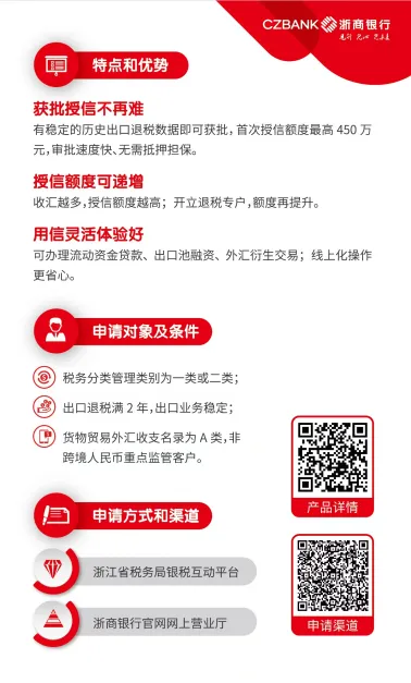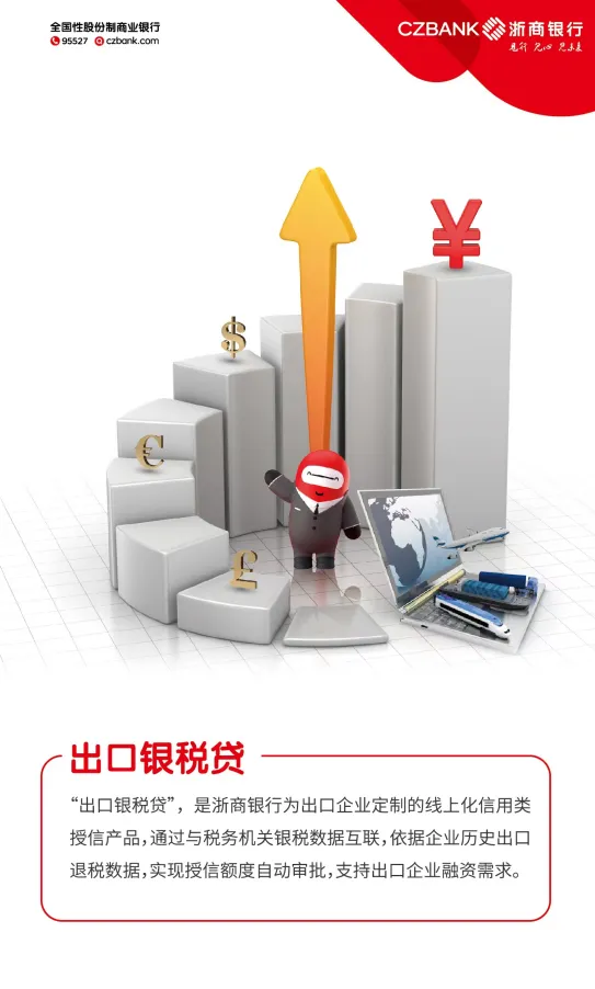 近期,浙商银行杭州临平支行推出“出口银税贷”业务,向辖内中小微出口企业提供信用贷款,化繁为简,创新金融服务、助力企业融资畅通。“出口银税贷”是浙商银行根据企业在税务机关“银税互动平台”上的出口退税数据,借助数据分析手段,结合少量人工作业,给予出口企业信用方式授信额度的授信模式,用于办理融资及外汇衍生交易业务,满足流动性需求。