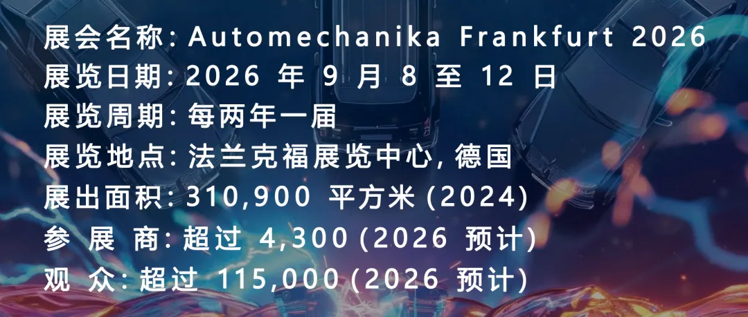 如今,Automechanika Frankfurt 已经当之无愧地成为了行业内影响力最大的国际顶级展览会,吸引越来越多的企业前往参展或参观。2026 年 9 月 8 至 12日,Automechanika Frankfurt 将再次成为汽车行业相关人士聚集盛地,预计将有超过 4,300 家参展商与超过 115,000 名专业观众汇聚一堂,共享合作发展新机遇!