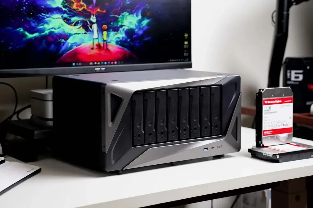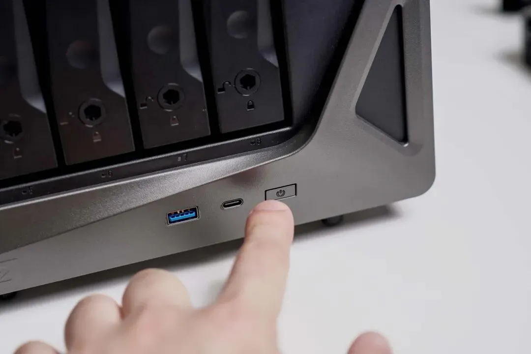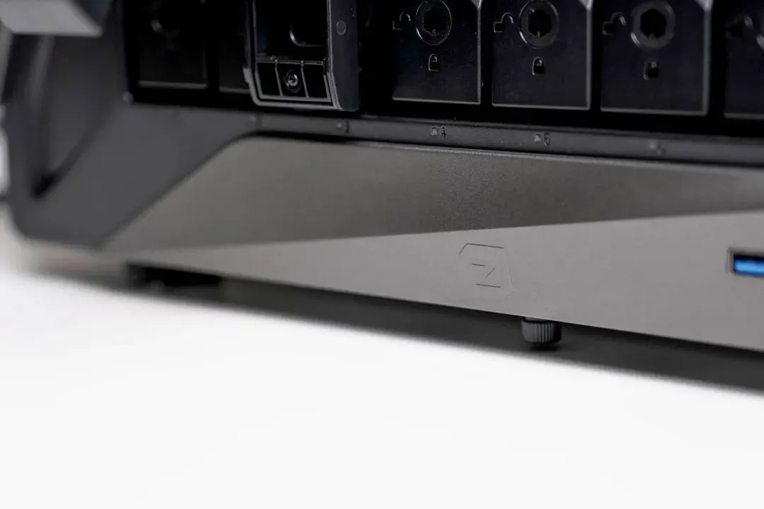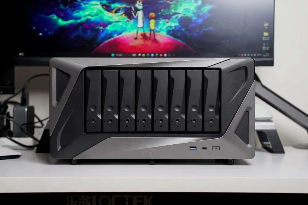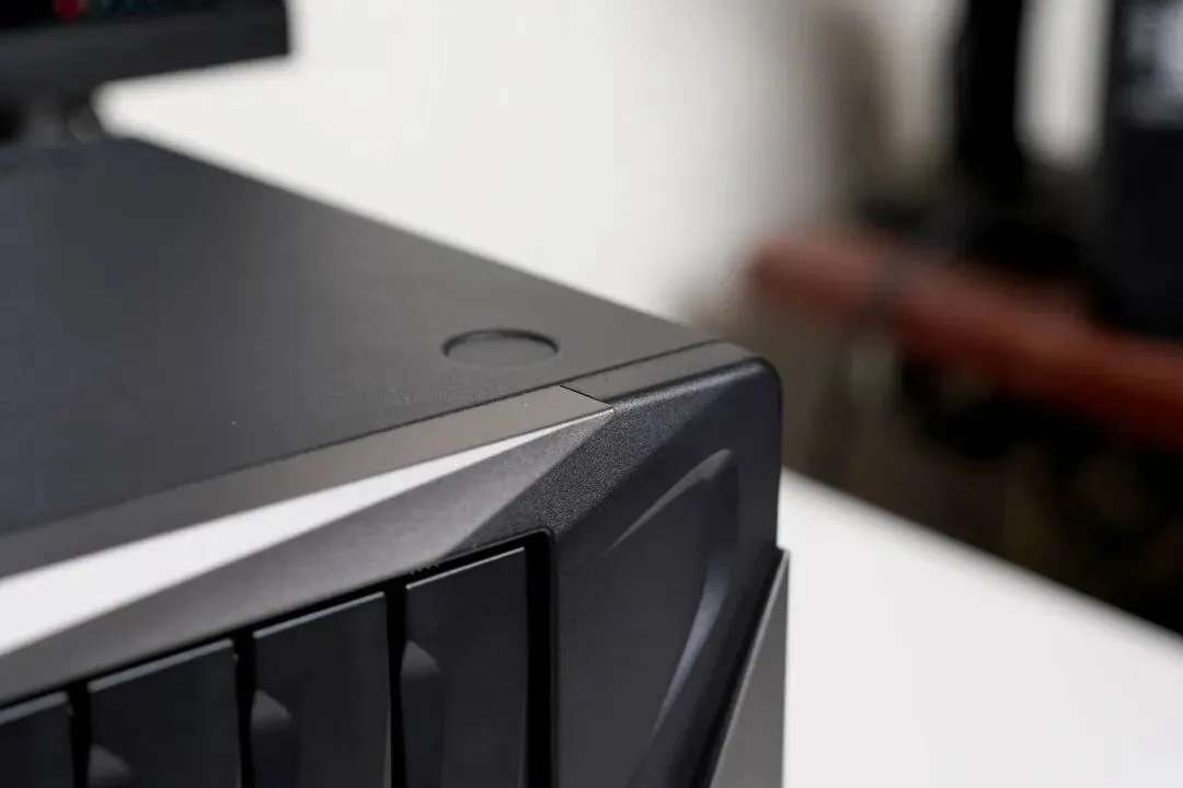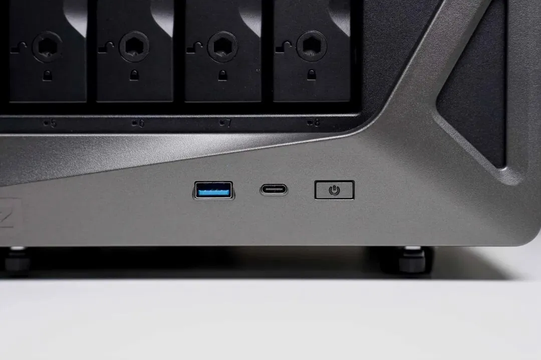 Z系列能作为原型机被游戏采集,圈外企业都认可的设计当然没得说,极空间P8+的设计确实科技感同样被拉满,材质为全钢结构+塑料前面板的组合,钢材保证放置稳定性,塑料则可以规避操作时触碰的静电。