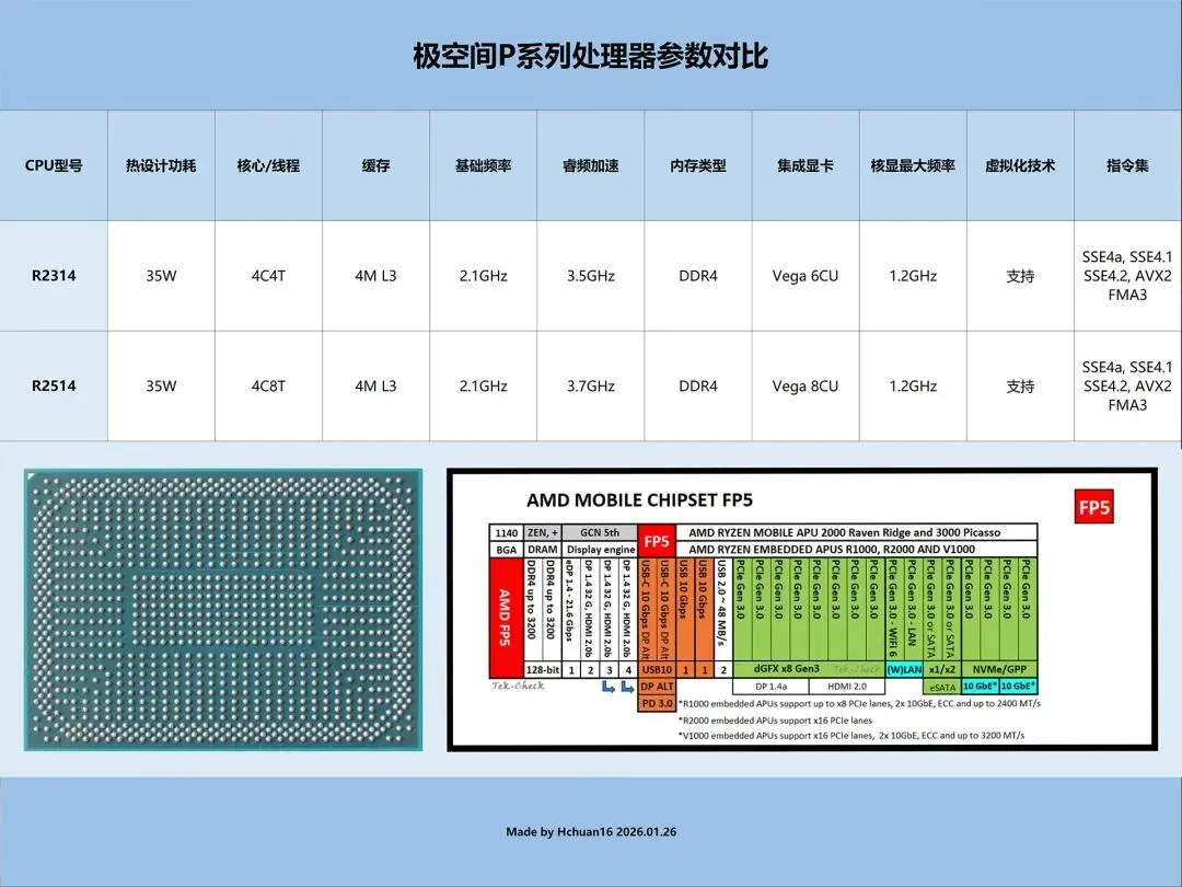 极空间P8+的CPU升级到嵌入式平台AMD R2514,对比上一代极空间P8使用的R2314升级点如下: