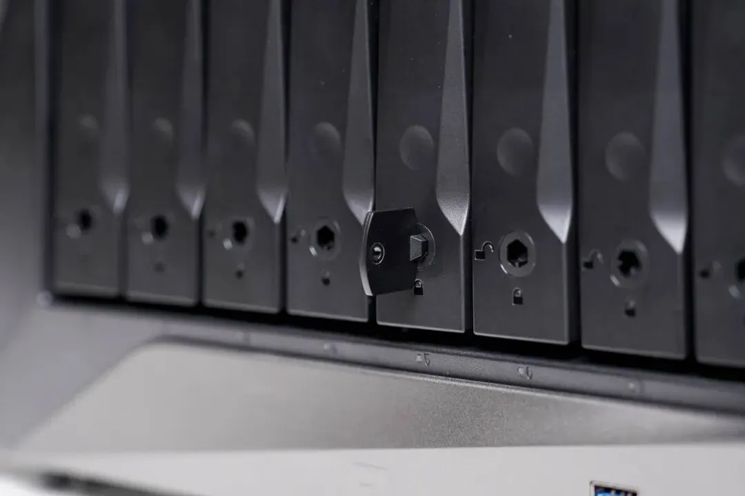 极空间P8+的硬盘笼有双重保护机制,本身内置了按下锁止的内置卡扣,下方还有额外的锁孔,非管理员很难取出硬盘,在物理层面保护数据不被盗窃。