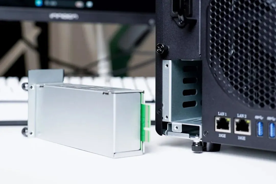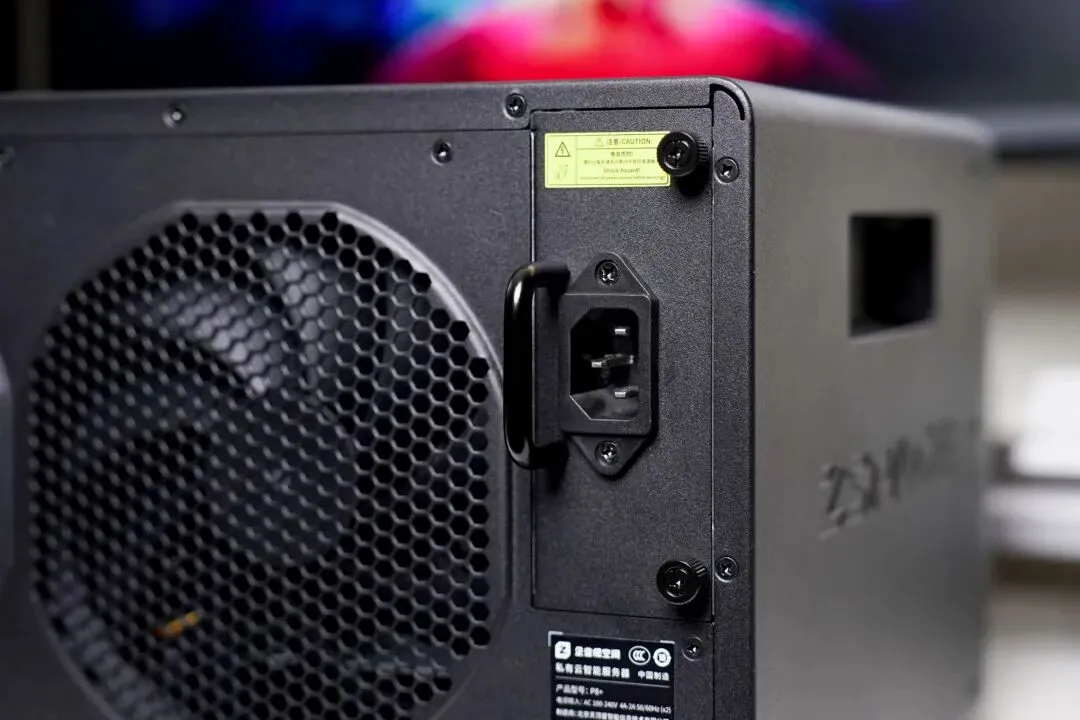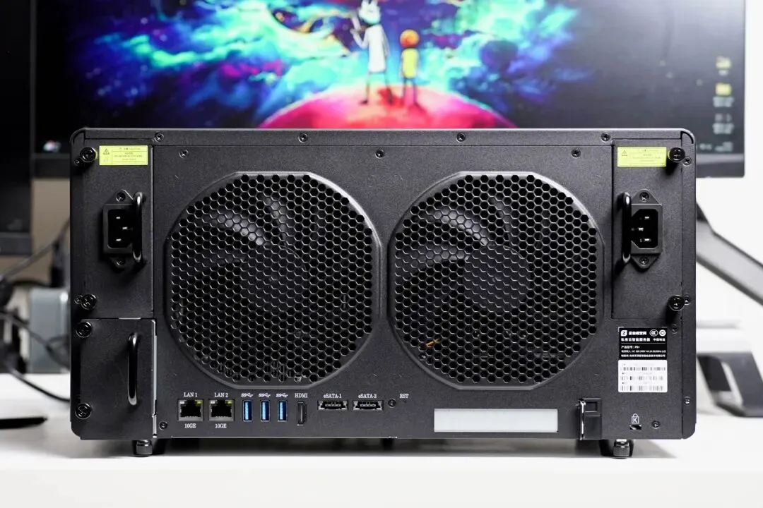从背面可以直观看到,极空间P8+为设备运行期间稳定性堆了非常多的料,包括双大尺寸风扇、双电源以及模块化的独立UPS。