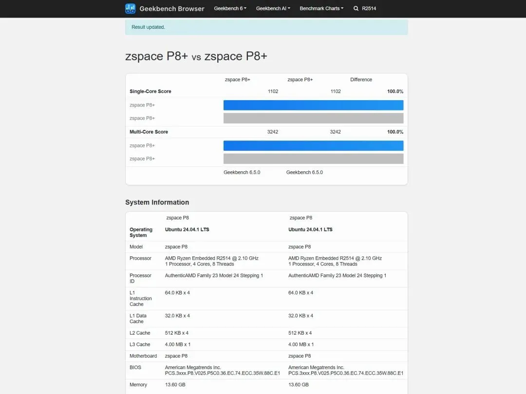 对比Geekbench收录的有效数据,极空间P8+的跑分是同样使用R2514设备中最高一档,BIOS调教和超强散热系统立大功。
