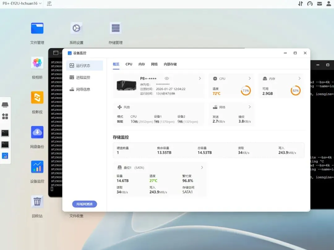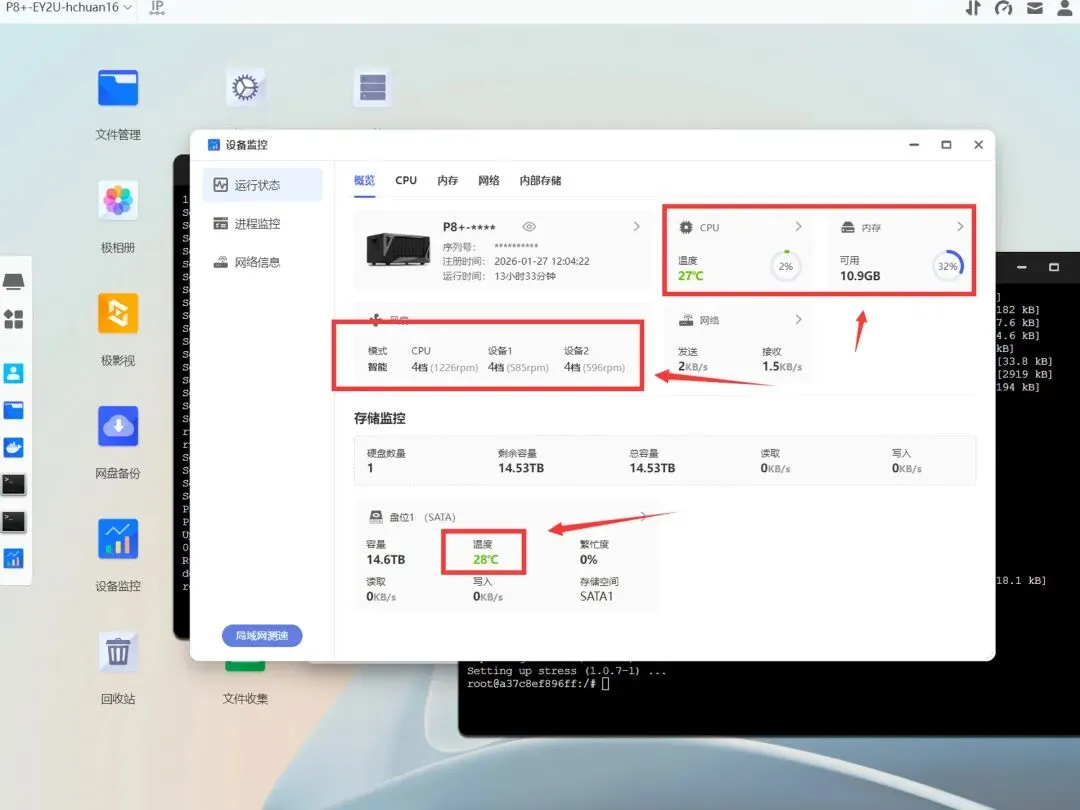 使用stress+FIO工具对极空间P8+进行压力测试,测试室温为10℃,CPU满核+8G内存调用,风扇策略使用默认的智能模式,压测30分钟的数据如下图所示: