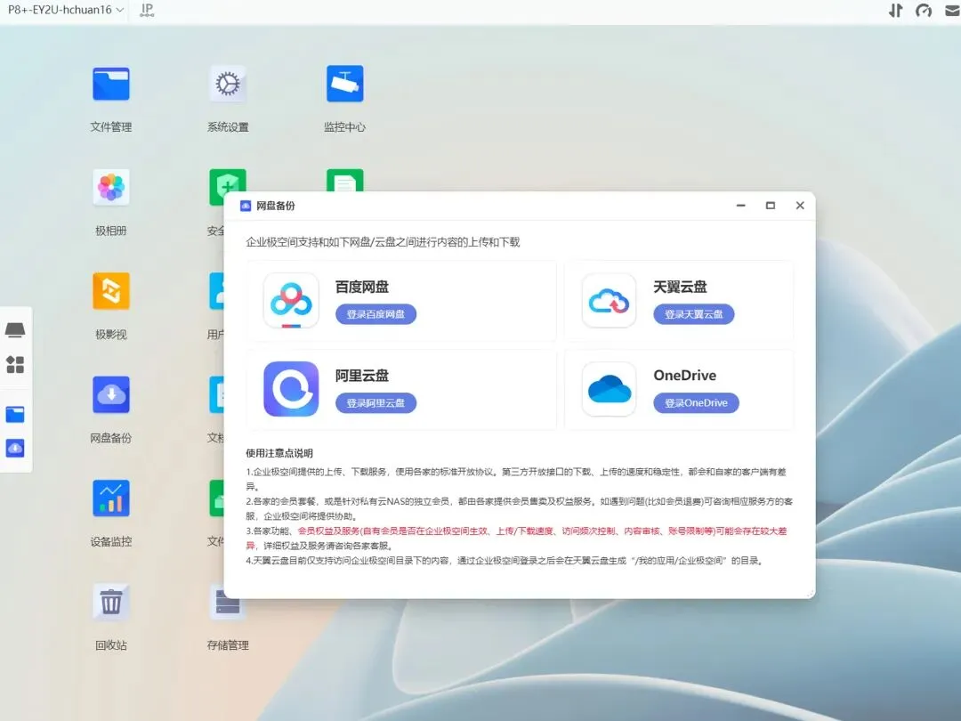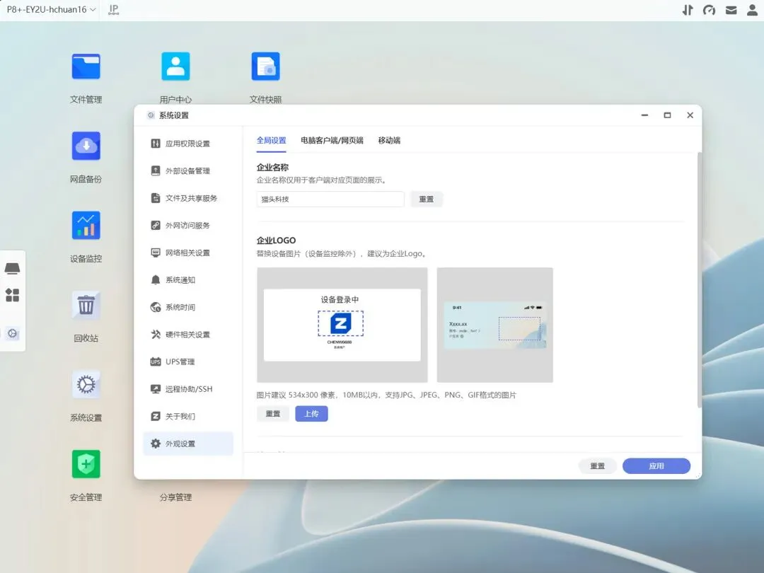 考虑到企业用户的个性化需求,极空间P8+提供了一键修改UI的功能,支持设置企业名称、登录Logo以及客户端背景,情绪价值拉满。