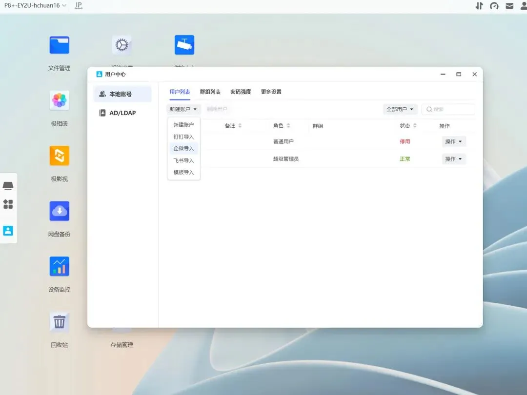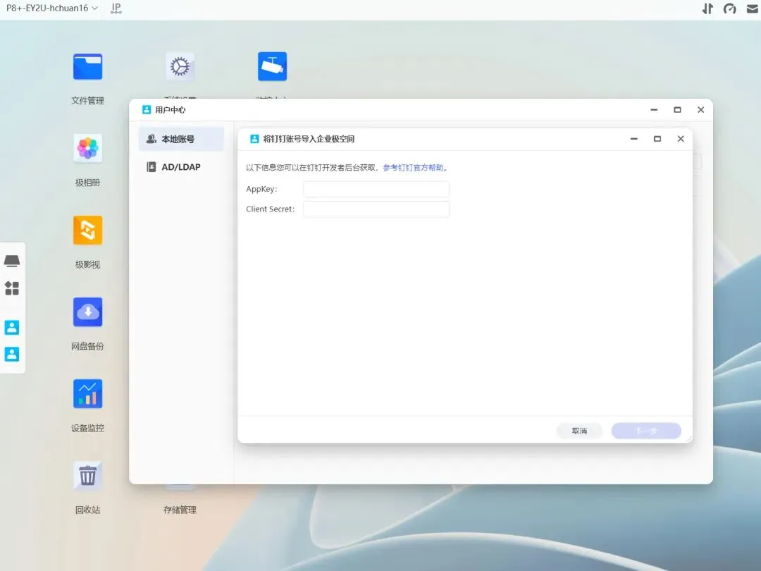 目前在用这三大办公SNS打通极空间P8+很简单,企业管理员去对应SNS官方获取秘钥,在EZOS的用户中心填入秘钥就一键导入并创建NAS账号。