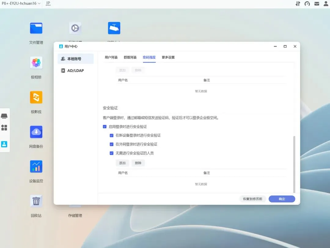 账号创建简单是一方面,极空间EZOS还提供了二级验证登录保护,用户登录和操作信息也能在日志中查看,不仅安全性拉满,也方便管理员溯源。