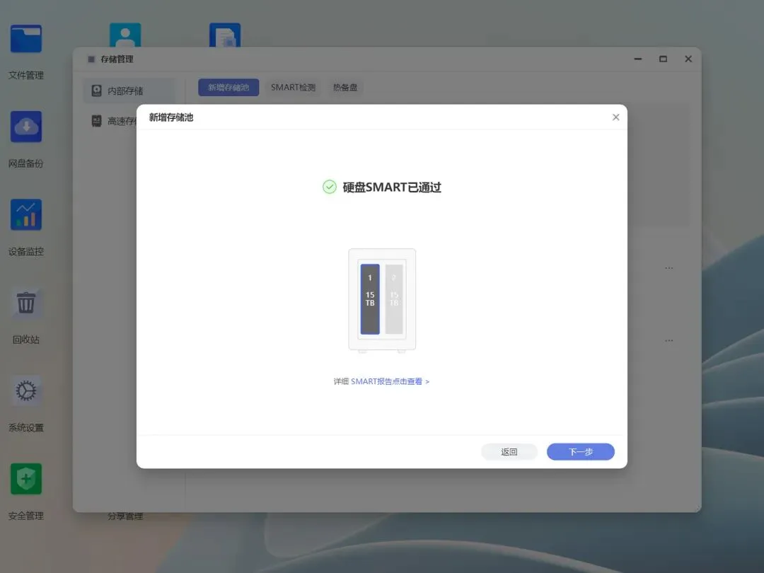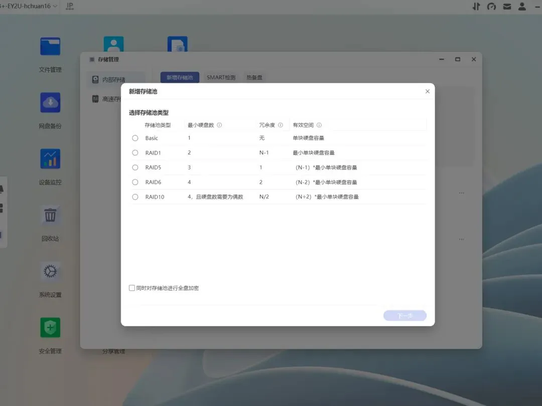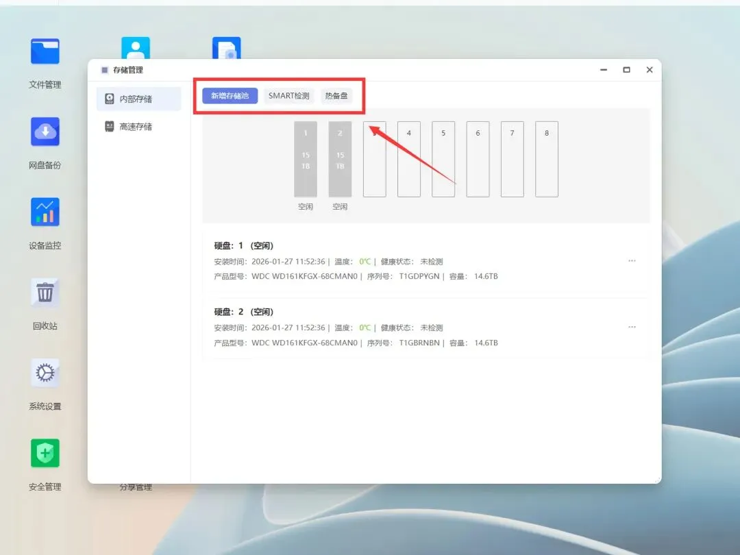 为了杜绝物理层面的数据丢失,EZOS在创建存储池时提供了独立的SMART检测机制,可以帮助用户快速判断硬盘健康度。