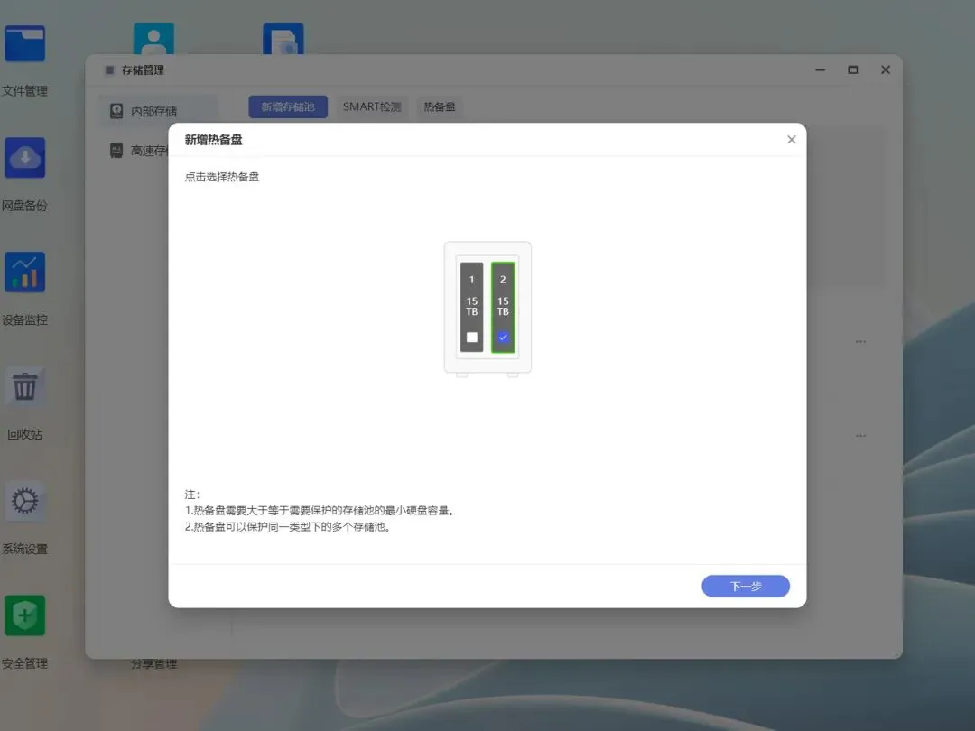 第一种热备盘可以简单理解为自动备份脚本,使用单块硬盘为单独存储池进行自动备份,优点是不会对硬盘有限制要求,并且支持固态机械混用,缺点是无法同时创建多个备份副本。