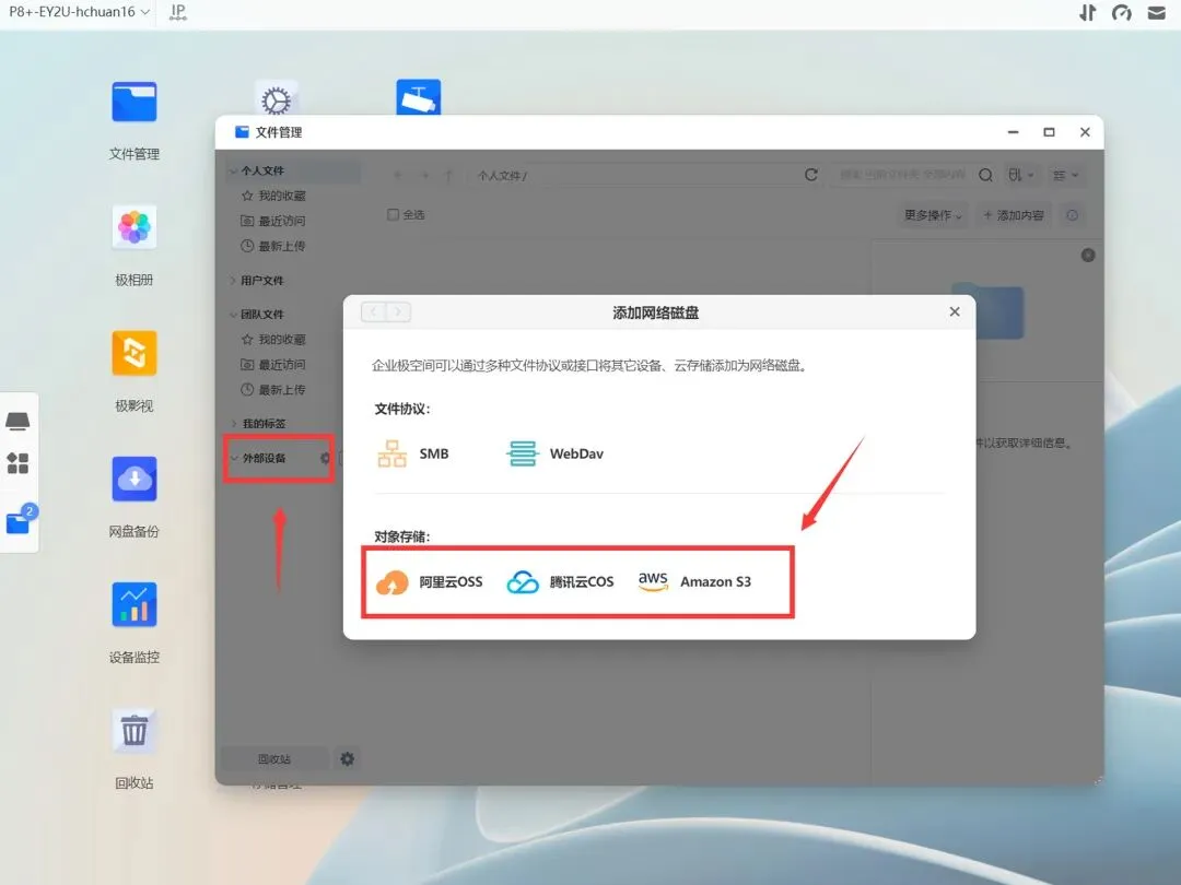 部分企业在部署本地NAS前可能会使用商用云存储,点击文件管理中的外部设备可以直接挂载,支持阿里云OSS、腾讯云COS和亚马逊S3这三个服务商。