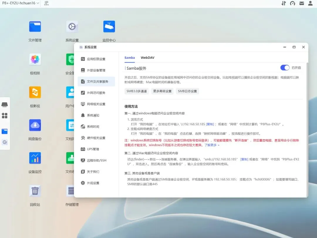 除了上面提到的主流云盘,小服务商和特定设备可以通过SMB/WebDAV挂载,极空间P8+在设置中开启这两个协议,也就是说能被外部设备挂载使用。