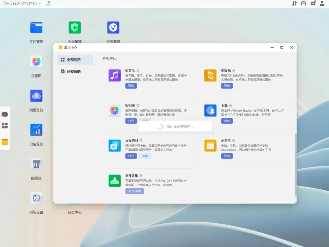 极空间P8+内置应用商店,简单说就是用户可以根据需求选择是否开启特定应用,可安装的应用和消费级极空间系统保持一致。