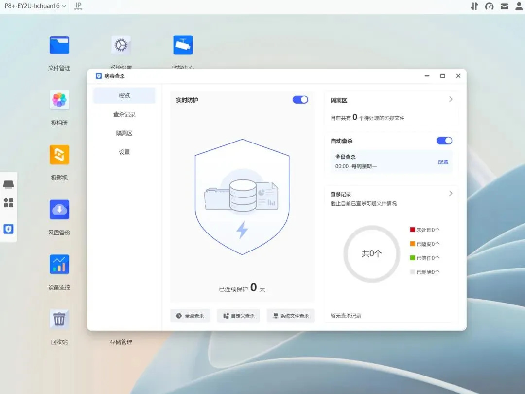 大型企业一般都有独立的硬件级防火墙,小微企业没有条件也没关系,极空间提供了本地和外部双重防护,本地可以配置定时查杀,正常开启就行。