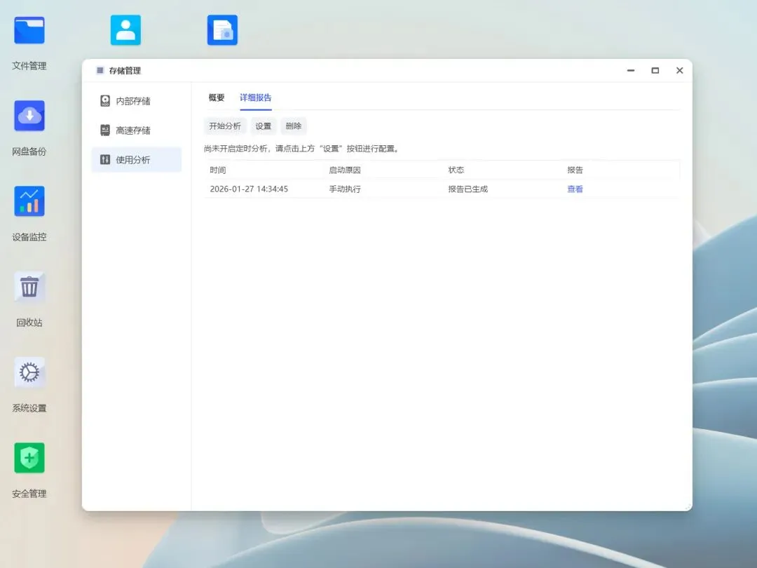 EZOS为后期使用也做了监控,在使用分析中可以配置定期生成报告,管理员可以根据报告判断是否需要做账号空间限额、更换老旧硬盘等维护操作。