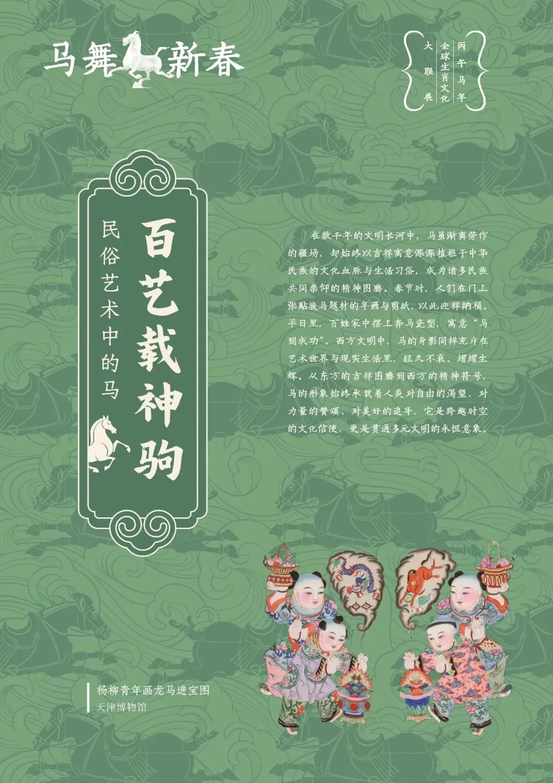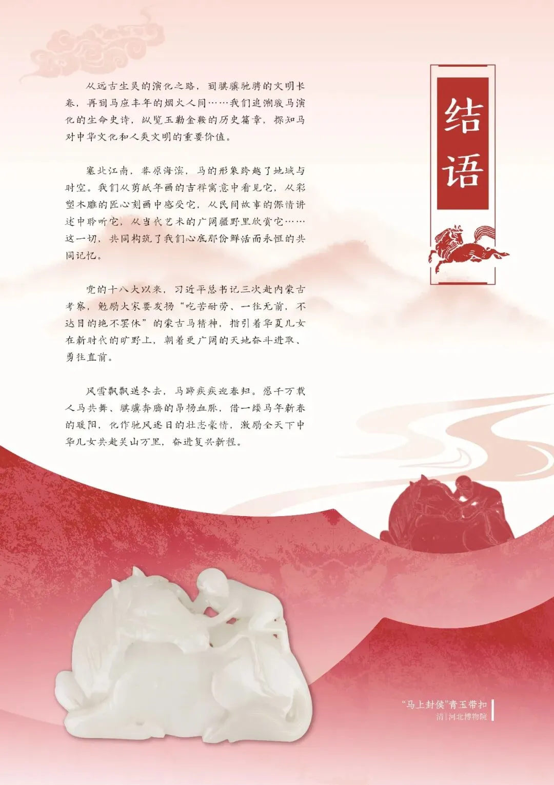 “马舞新春——丙午马年全球生肖文化大联展”是由中国文物报社携手国内50余家文博机构共同策划的。展览以图像为核心载体,系统呈现中国传统生肖文化与马文化的深厚内涵及艺术魅力,细致梳理中华文明中“马”的精神形象与文化脉络。展览紧扣“人马相伴”主题与主线,精心设立“鸿蒙生灵骏”“骁骑贯山河”“百艺载神驹”三个章节,从自然生态、历史演进、民俗艺术三个维度出发,系统阐释马在中华文明——尤其是北方草原文化中的独特地位与精神象征,生动展现马文化在推动文明交流融合、凝聚民族情感过程中的时代价值。