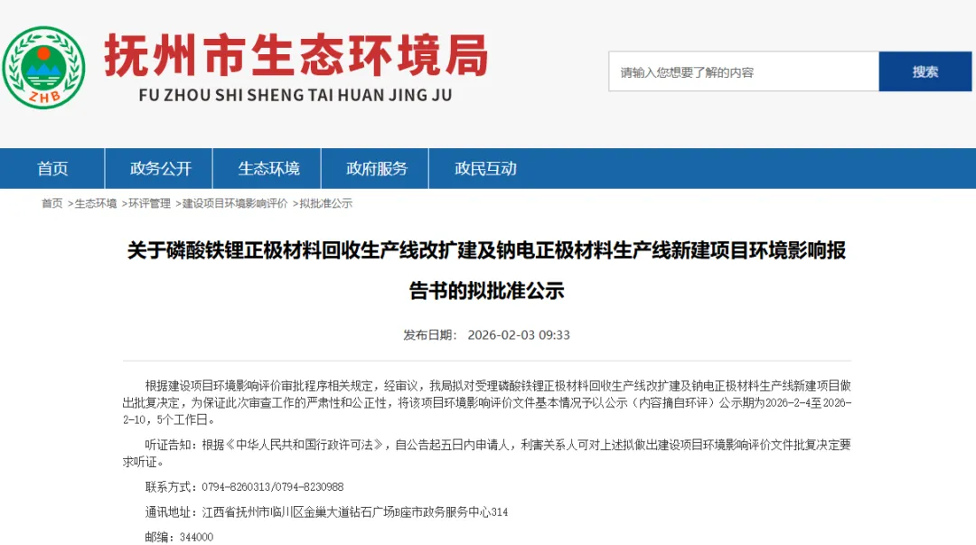 2月3日,抚州市生态环境局发布了《关于磷酸铁锂正极材料回收生产线改扩建及钠电正极材料生产线新建项目环境影响报告书的拟批准公示》。公示文件显示,伟邦材料计划投资2.1亿元,在其位于抚州市乐安县厚发工业园的现有厂区内实施该项目。