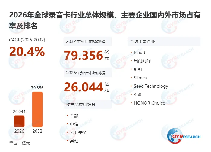 QYResearch调研显示,2025年全球录音卡市场规模3.2亿美元,预计到2032年将达到11.7亿美元,2026-2032年预测期内的复合年增长率为20.4%。