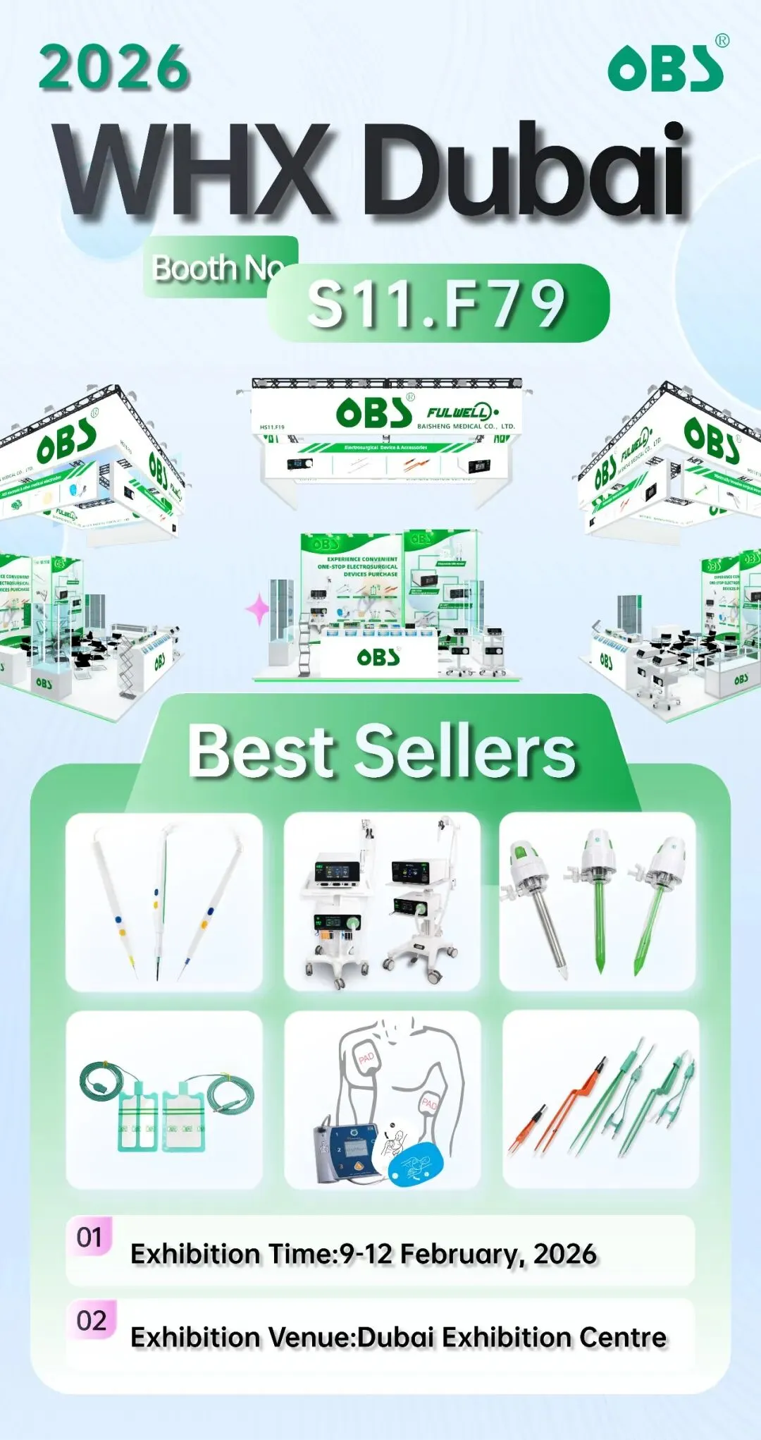 本届WHX Dubai 2026展会,OBS百生医疗将继续携旗下电外科设备和耗材、医用电极、微创手术器械等领域明星产品精彩亮相。