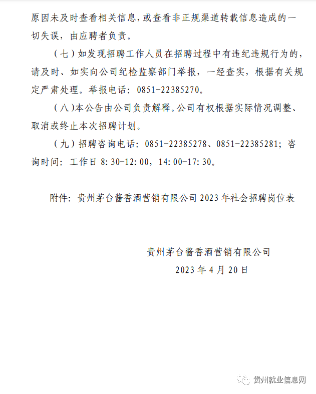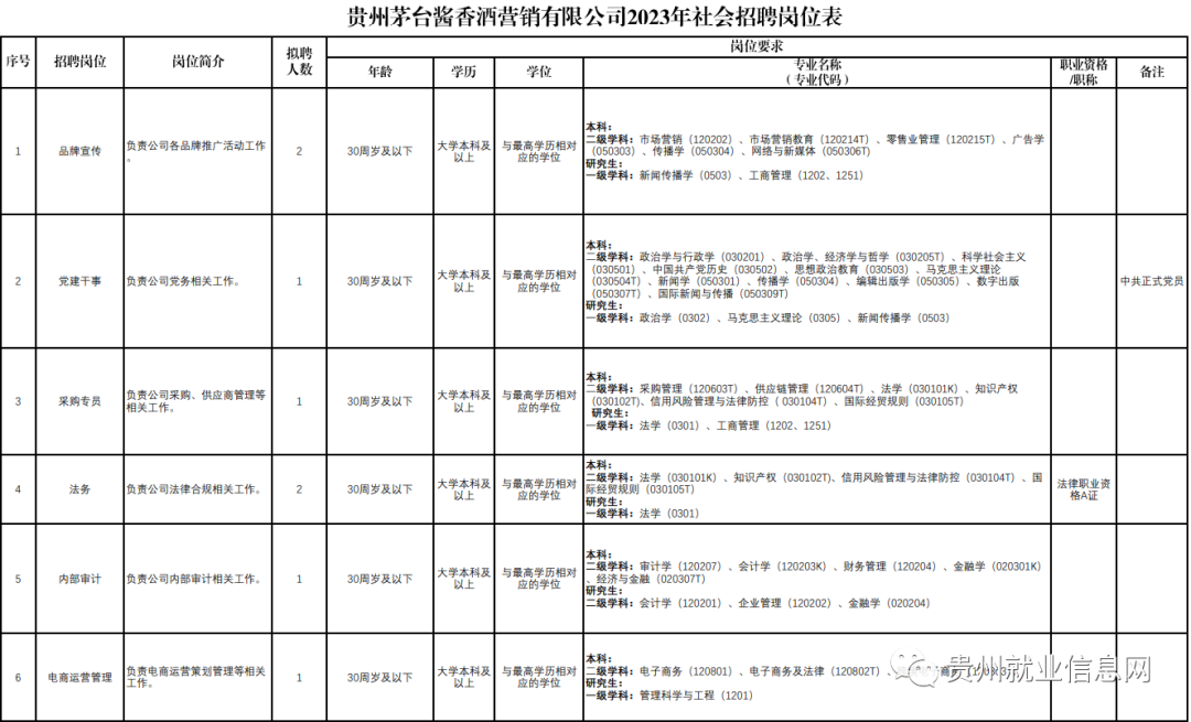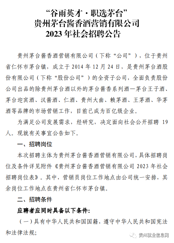 8岗招19人!贵州茅台酱香酒营销有限公司2023年社会招聘公告