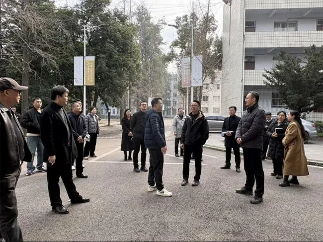 曹杨一行调研了老校区办公楼、实训室及其他可利用空间,详细了解场地规模、结构特点及改造潜力。双方围绕如何利用现有建筑资源,打造符合微短剧拍摄需求的室内外场景进行了现场交流与探讨。